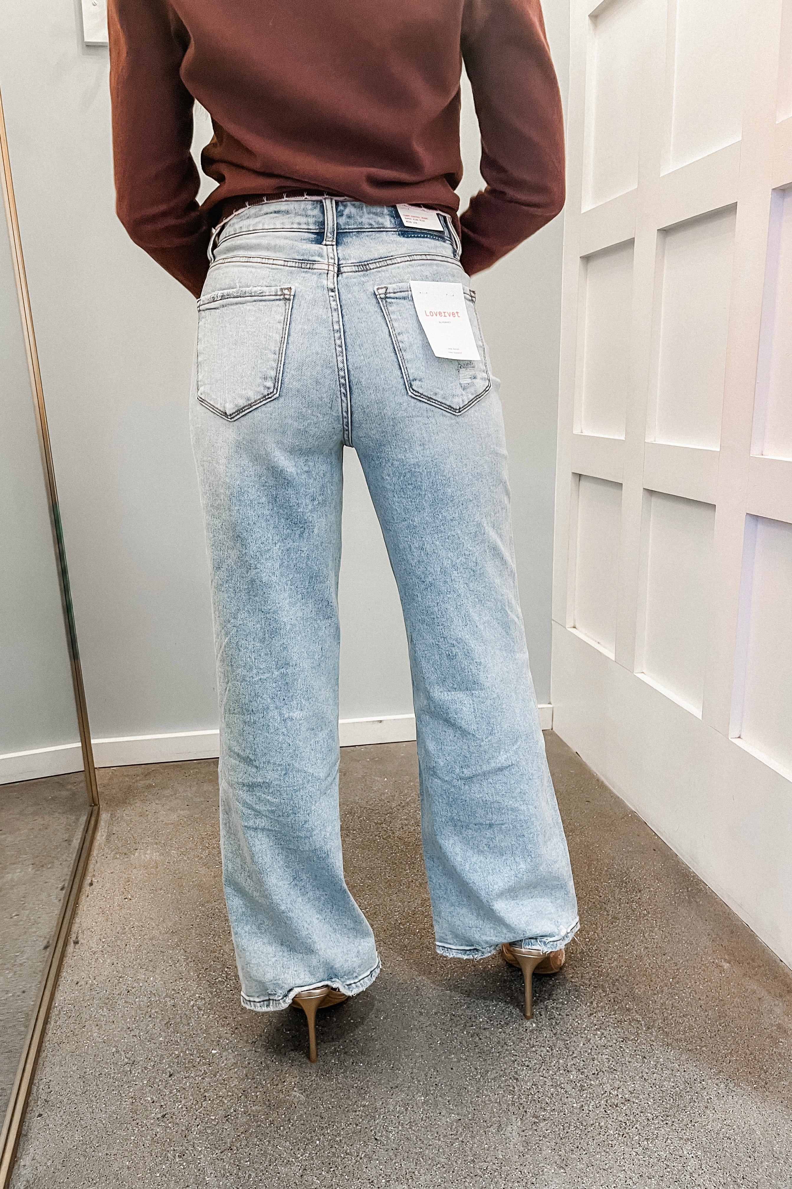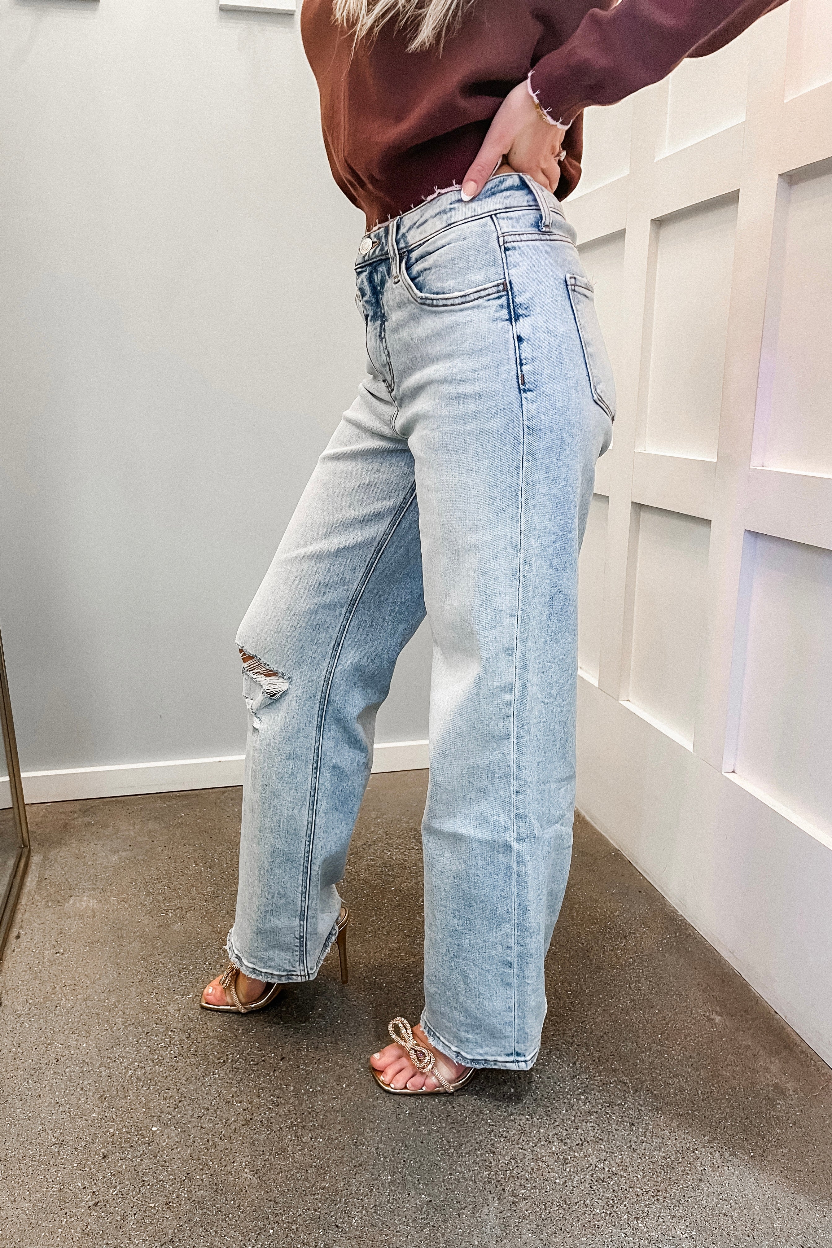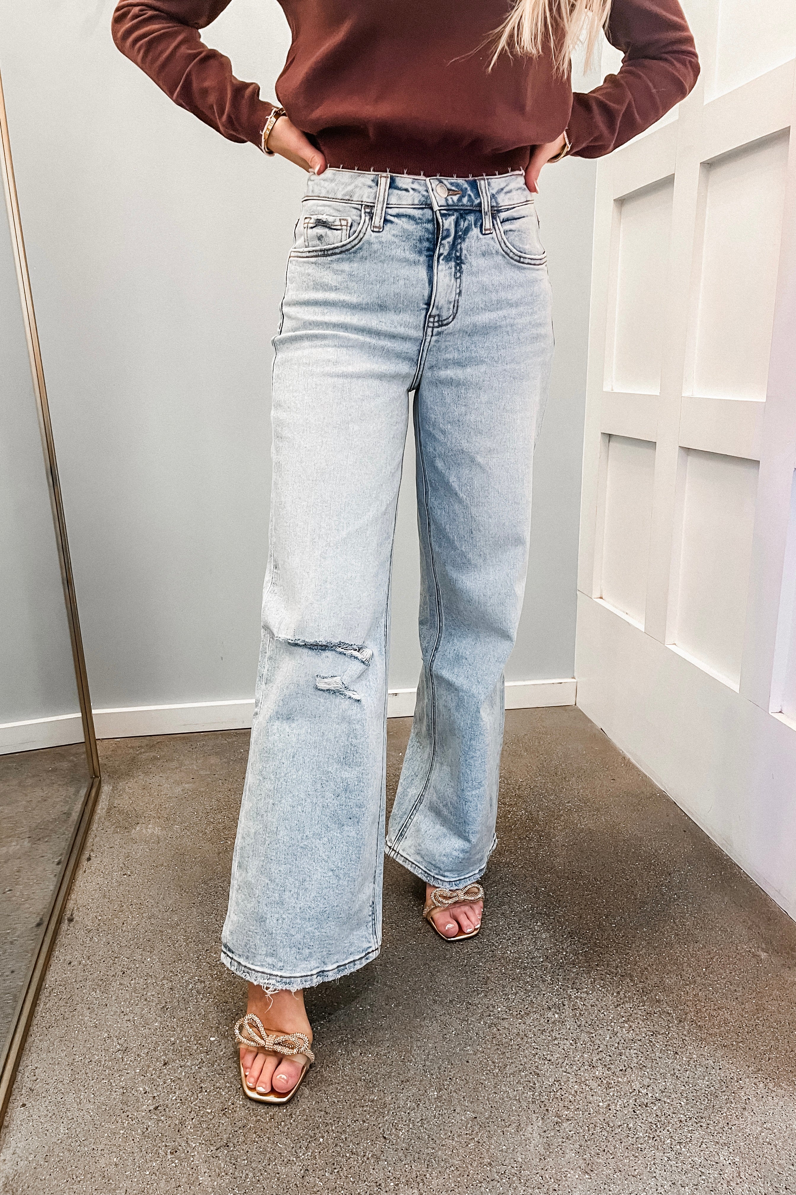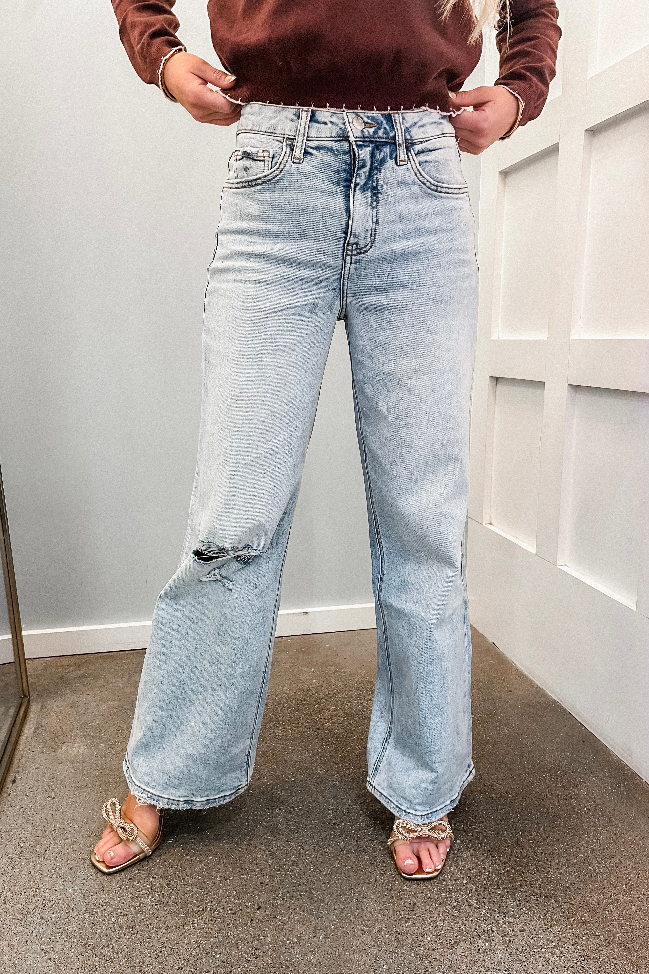 These! Such a good pair! Our Hidi High Rise Wide Leg Jeans feature a light wash, distressing, and a wide leg fit. True to size. Ariel is 5'5" and is wearing a 25.