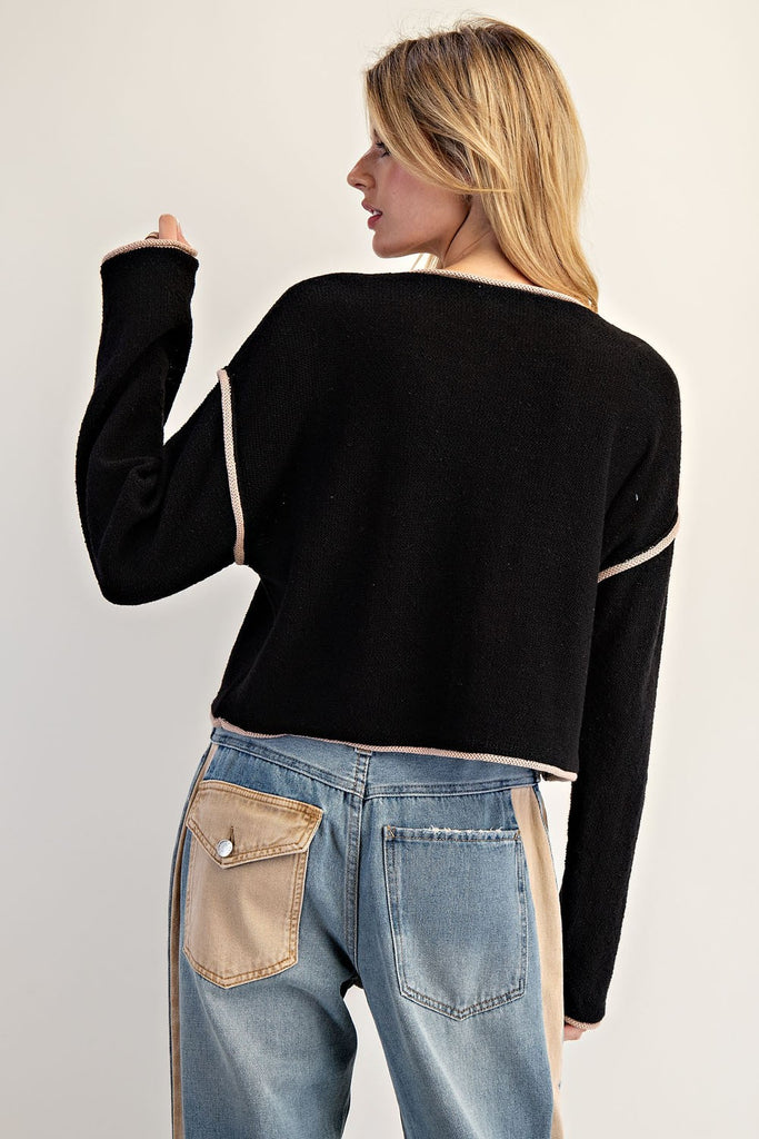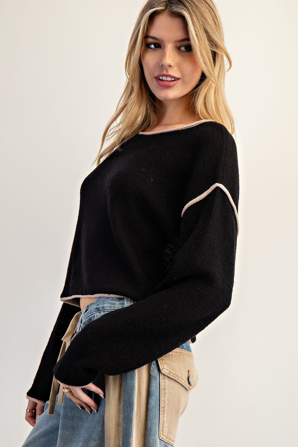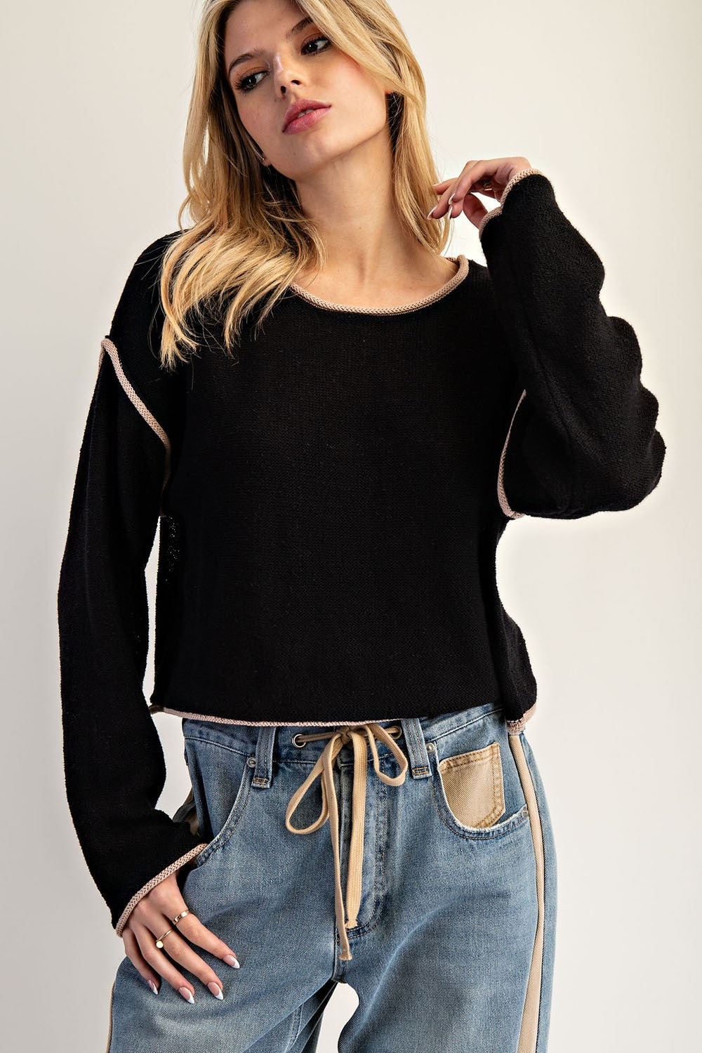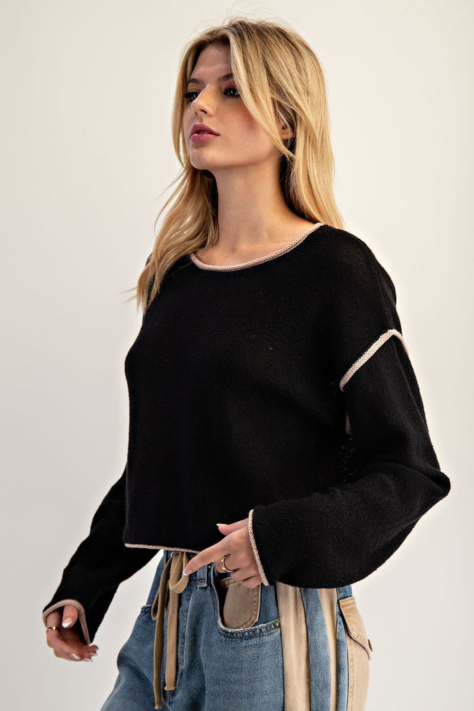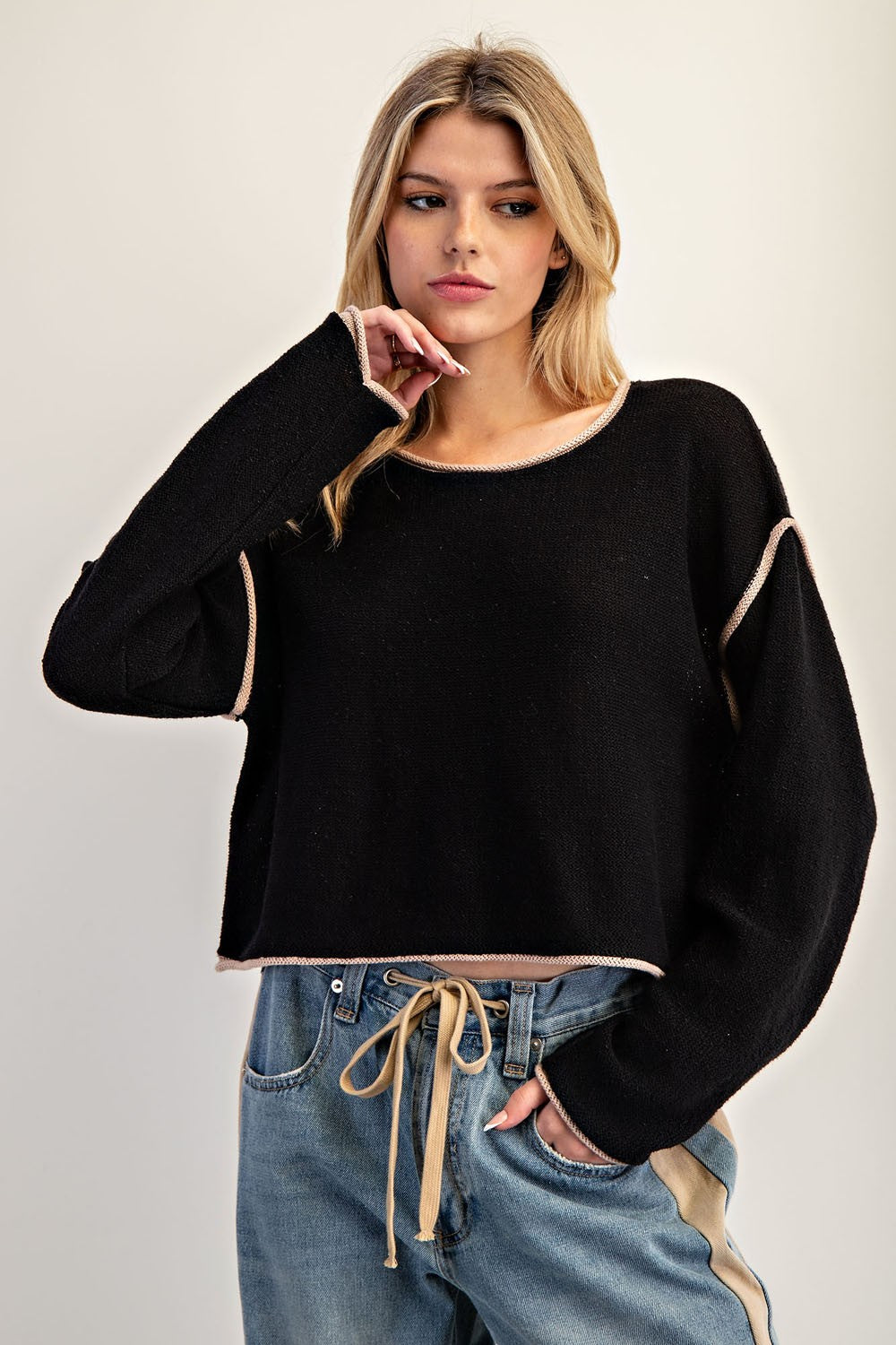 This long sleeve knit top features a textured open weave, exposed contrast seam detailing along the dropped shoulders and edges, a wide crew neckline, and a relaxed cropped hem for an easygoing and effortless finish.