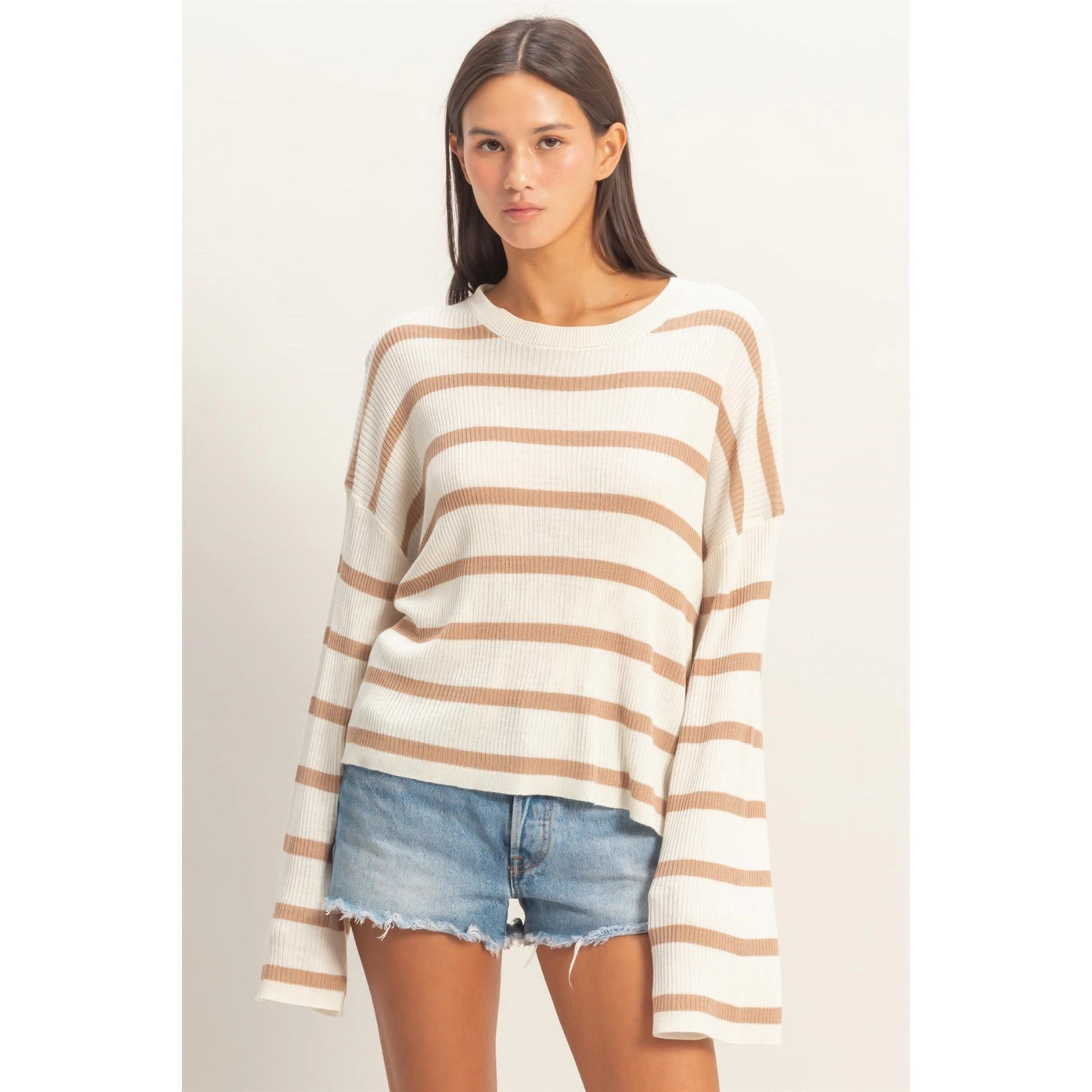 This lightweight essential pullover is created with a soft rayon and acrylic blend, featuring a vertical ribbed texture and bold horizontal stripes. The design includes a gentle crew neckline and roomy drop-shoulder wide sleeves. Cut in a relaxed fit, it pairs perfectly with a denim skirt and ankle boots for a casual weekend outfit. 50% Rayon 50% Acrylic