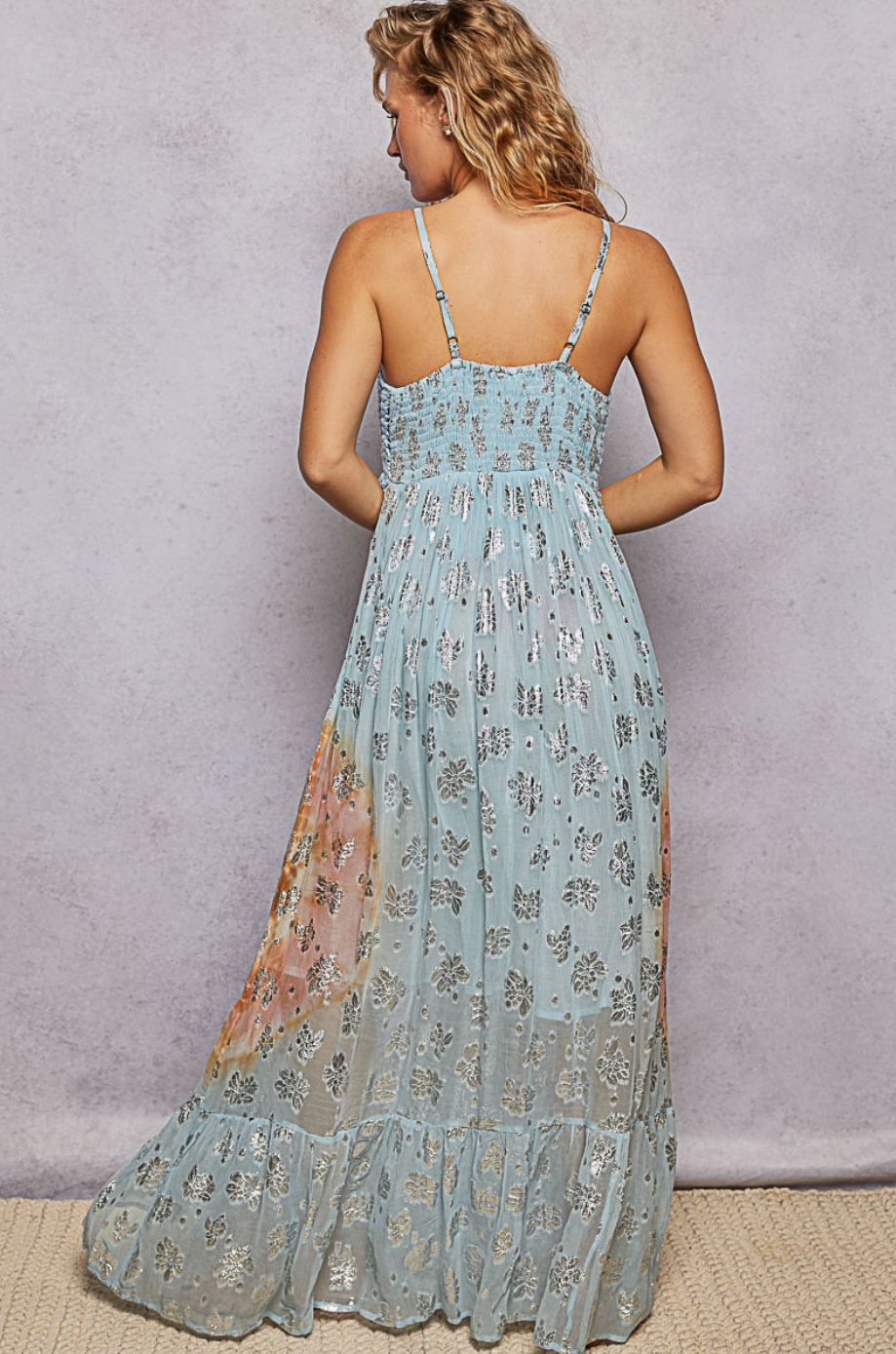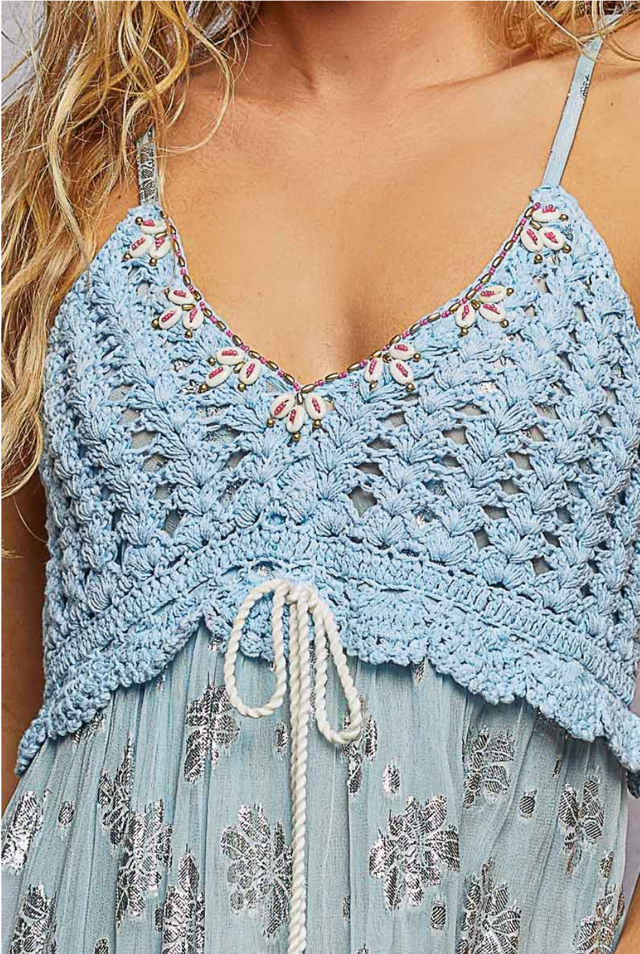 A deep V-neck sleeveless long dress in soft viscose, featuring a crochet top with spangled neckline, a tassel-accented waist loop, mirror embroidery, and gentle ruffle details. Designed with bra adjustment and a comfortable lining, this dress offers a feminine, bohemian-inspired look. Specs/Dimensions: - LENGTH : 55" - BUST : 15-1/2"