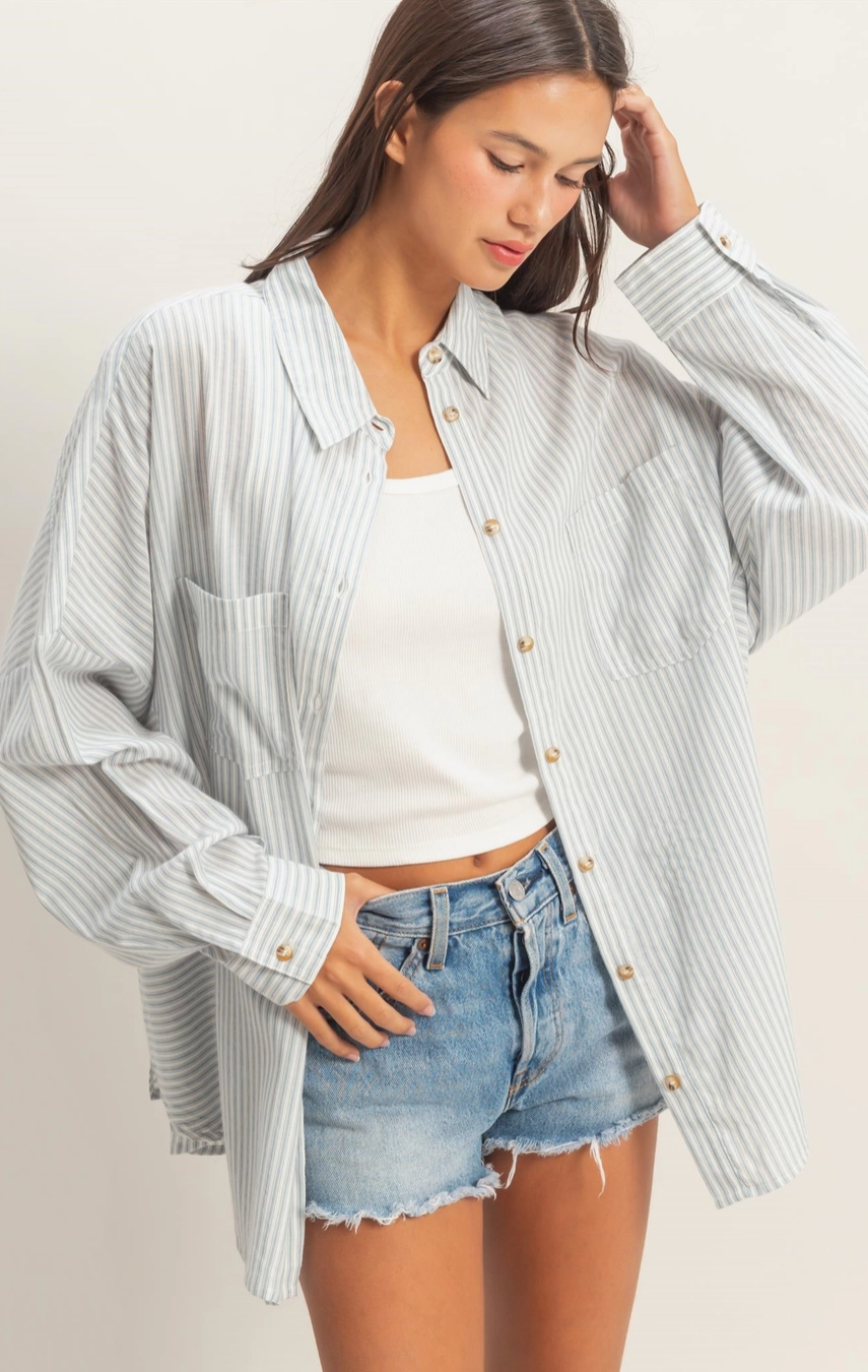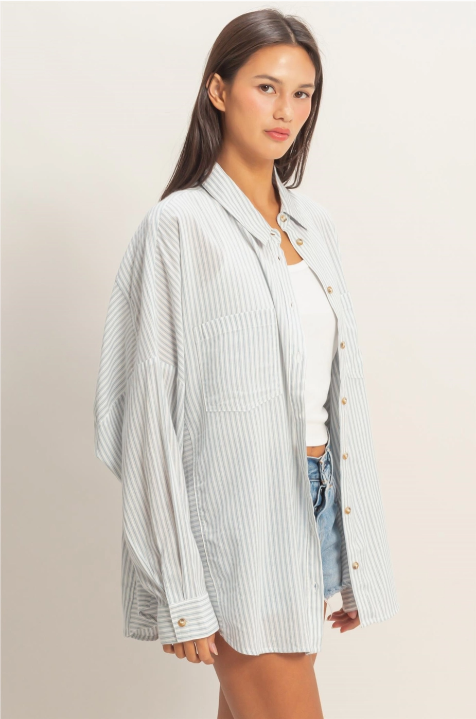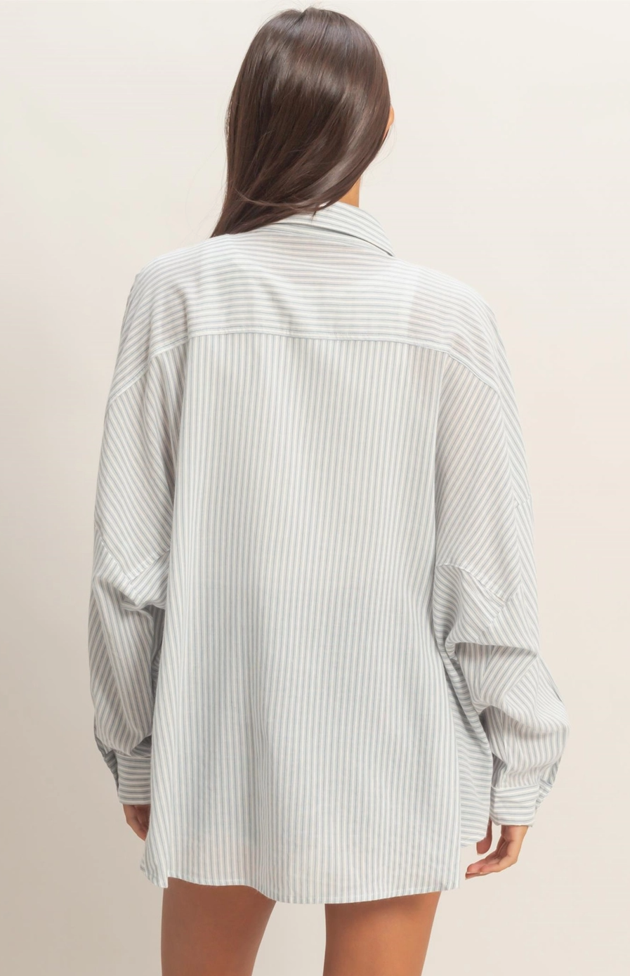 This striped button-up is crafted from crisp striped cotton, featuring twin patch pockets, sharp spread collar neckline and full long sleeves with traditional button cuffs. The cut is intentionally oversized, providing a relaxed fit that drapes effortlessly. Style with tailored trousers and a sleek belt for a polished, yet relaxed ensemble.