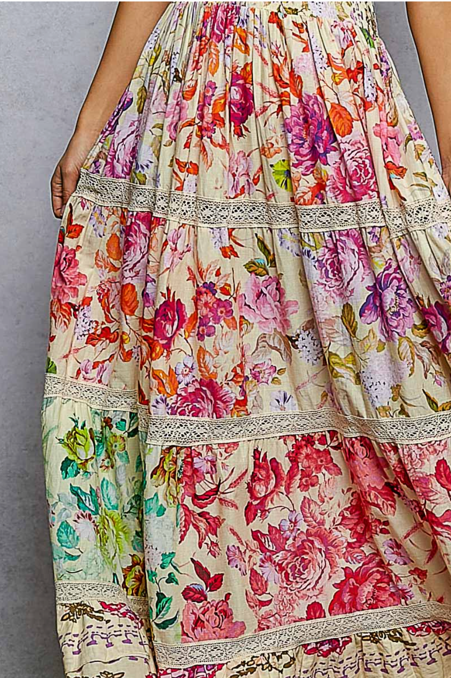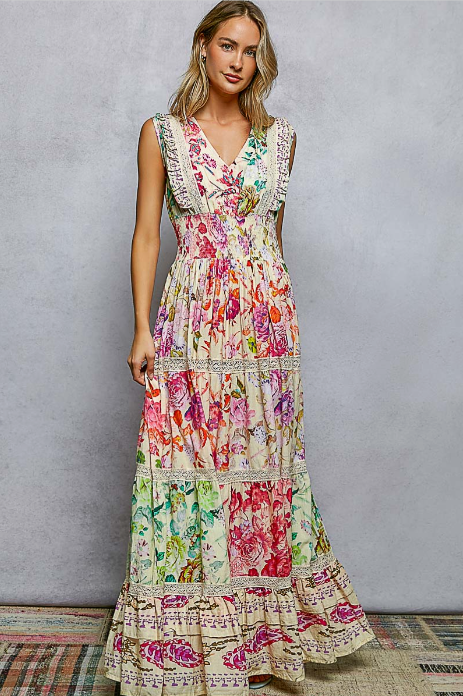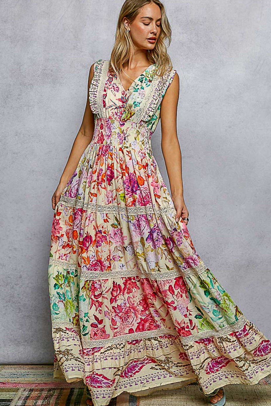 A V-neck sleeveless long dress made from printed cotton, featuring trim details, an emphasized smocked waist, ruffle accents, and a delicate floral pattern. A feminine and effortless piece perfect for everyday or special occasions. Specs/Dimensions: - LENGTH : 34-1/2" - BUST : 55-1/2"