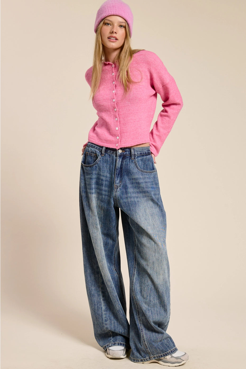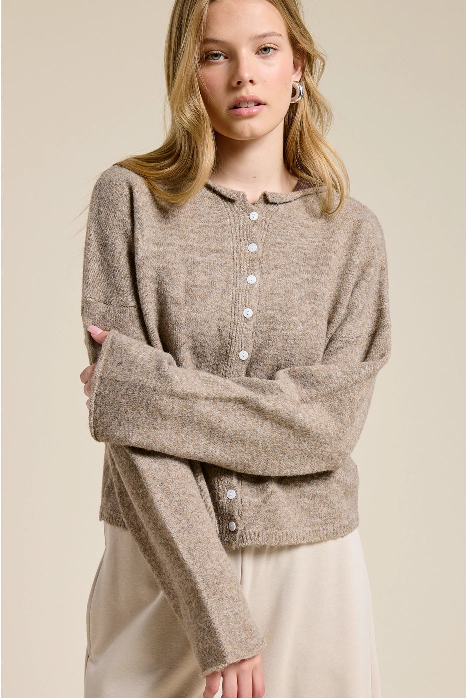 The perfect blend of classic and contemporary, this staple cardigan top features a rolled collar, button-down front, and long sleeves with dropped shoulders. Has a regular length, ribbed hem detail, and a super soft lightweight, relaxed fit makes it versatile enough to wear on its own or as outerwear year-round