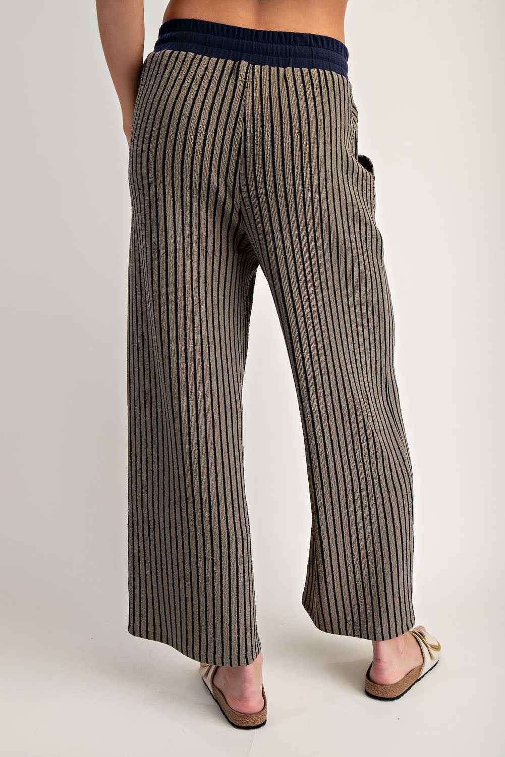 These striped knit pants feature a soft textured feel with a relaxed straight leg silhouette, a contrast elastic waistband with an adjustable drawstring, and side hip pockets for an easygoing yet elevated lounge look.
