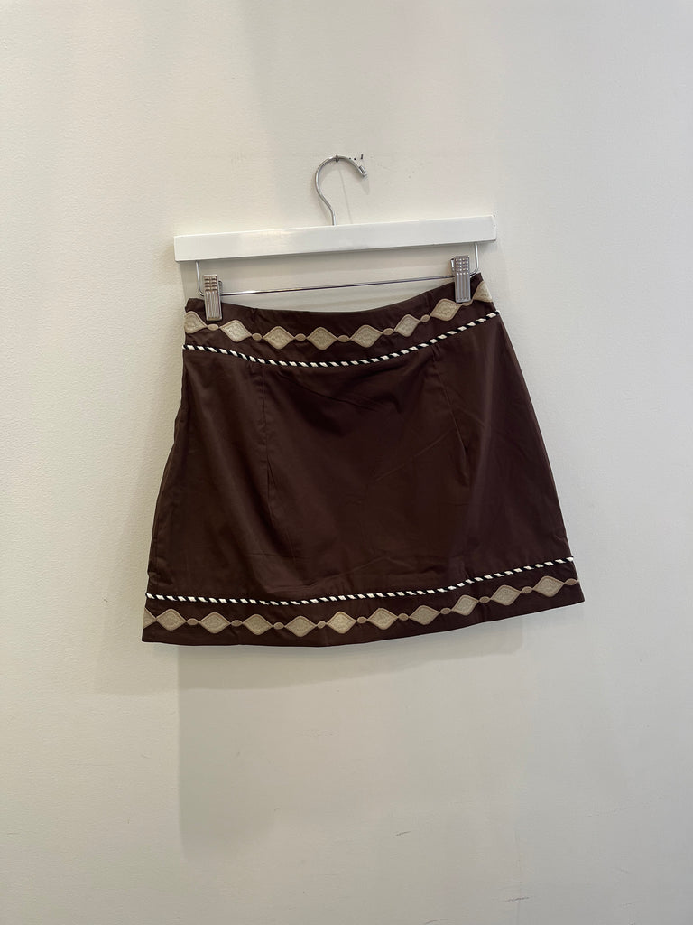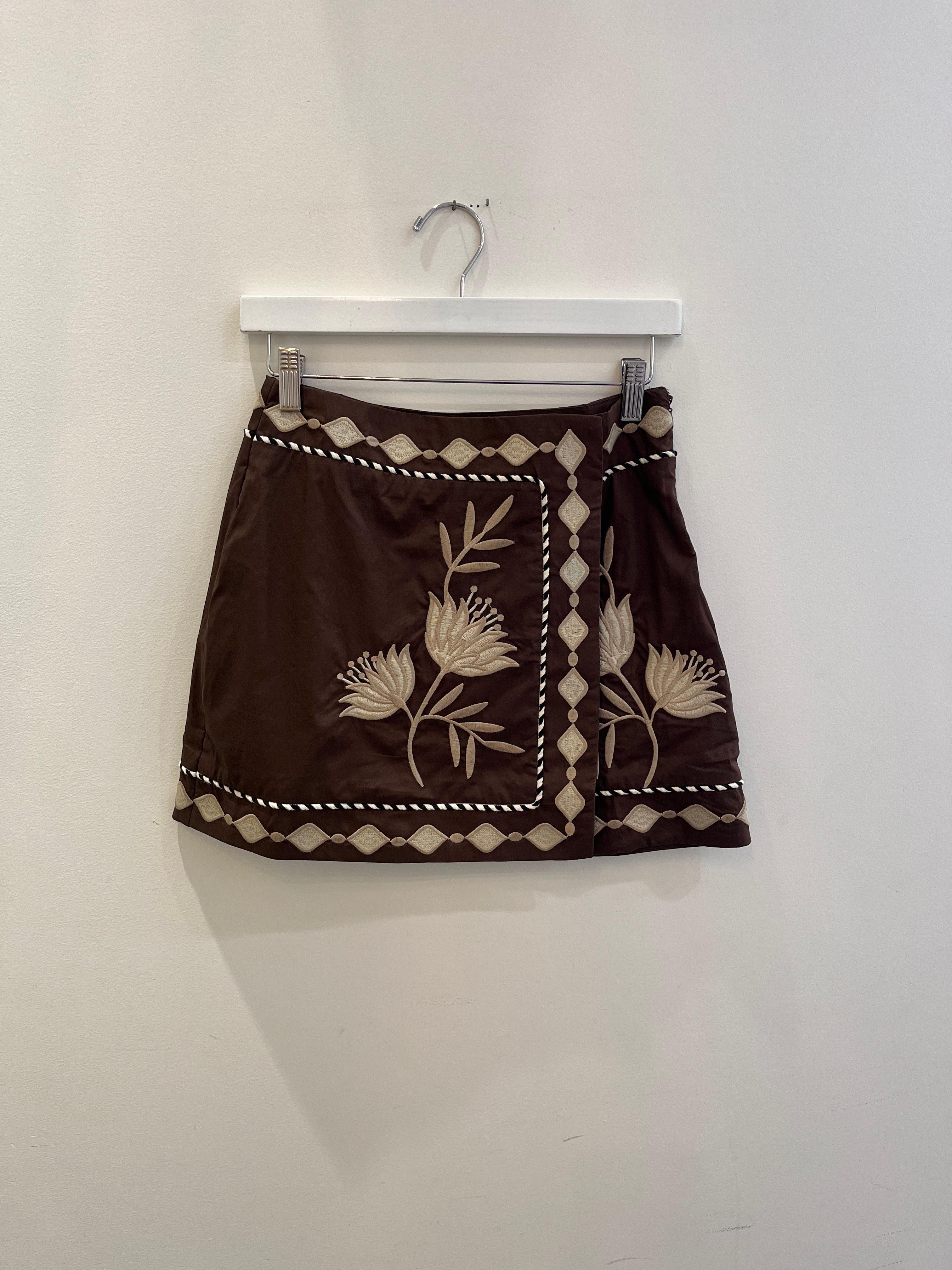 Embroidered wrap style mini skirt set. Skirt has lining and side invisible zipper. Lining.