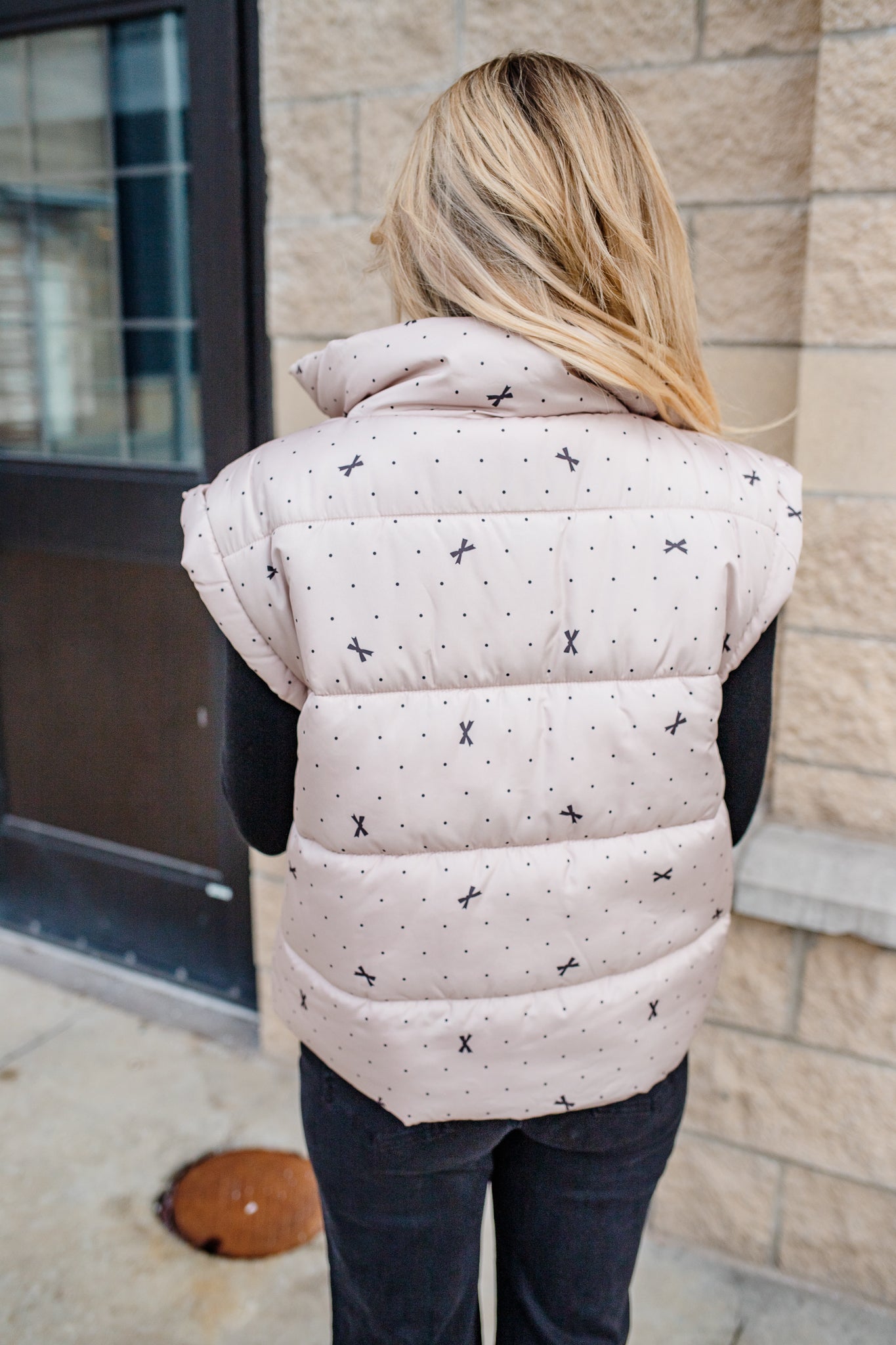 Polka Dot Bow Puffer Vest - Light Khaki / Small is backordered and will ship as soon as it is back in stock.