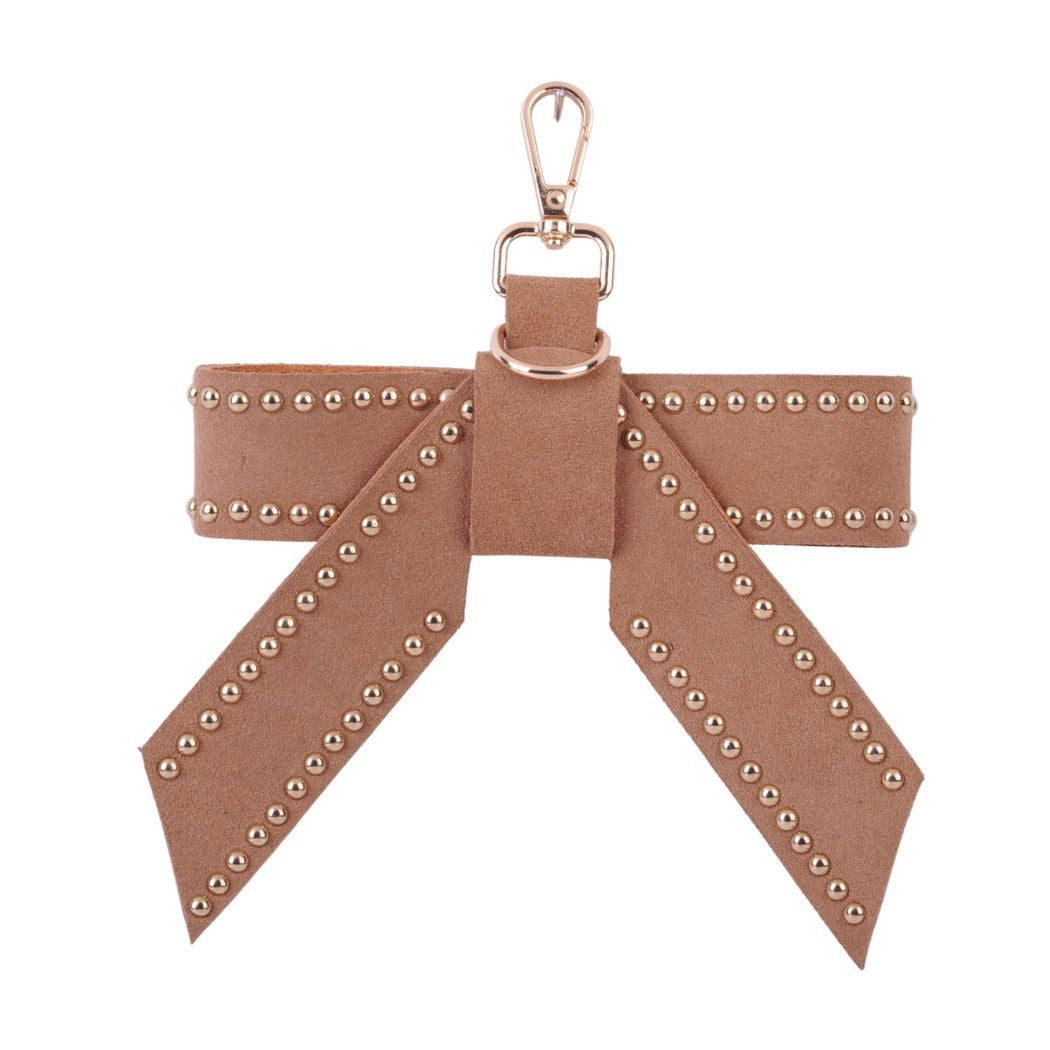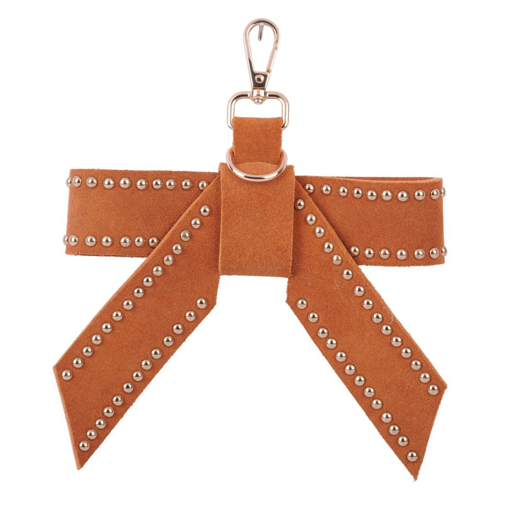 This suede bow is the perfect little charm to dress up your bag or backpack. Accented with brass studs, it adds a touch of personality and detail to any look. Pair it with a sparkly beaded keychain, a tiny good-luck charm, or let it shine solo for a classic, minimalist vibe.