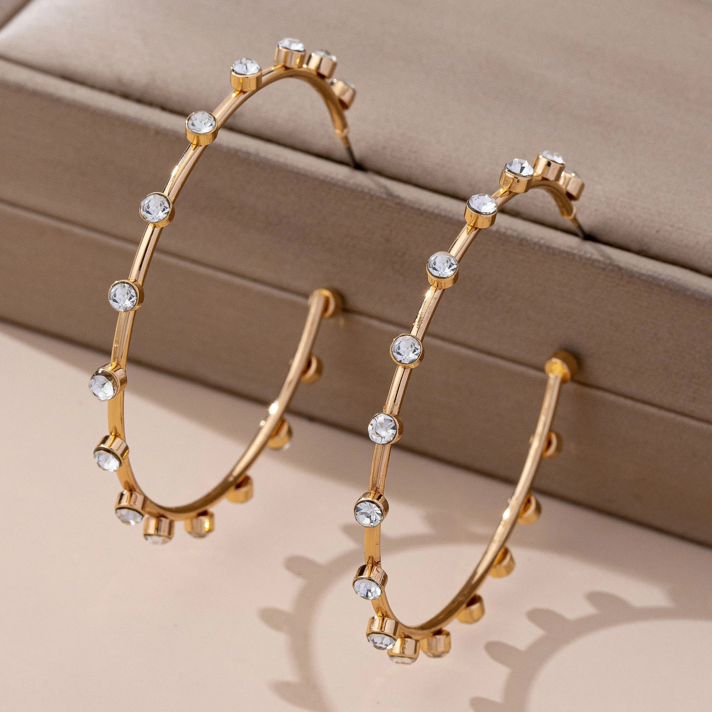 Add some sparkle to your hoop game. These gold hoops are studded with crystals that catch light from every angle. Simple, stunning, and perfect for dressing up any look.