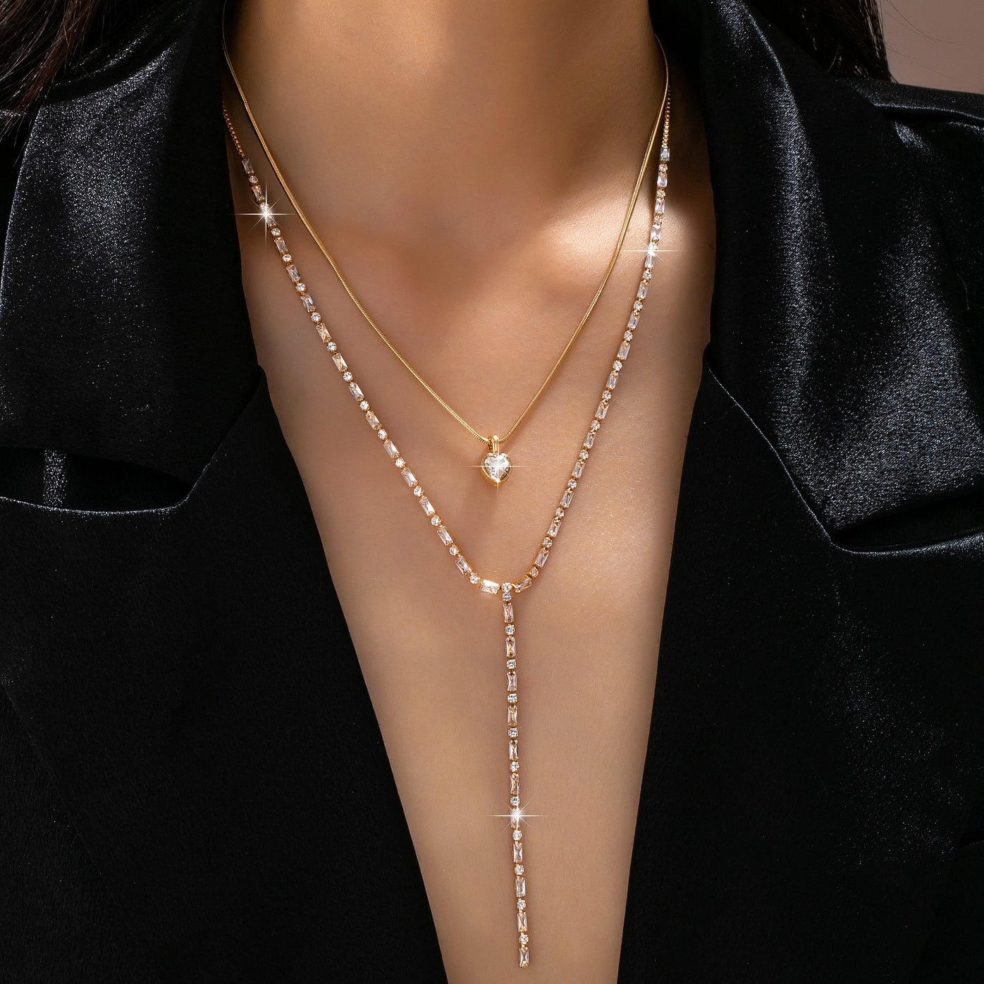 Layered Y Heart and Baguette CZ Crystal Necklace