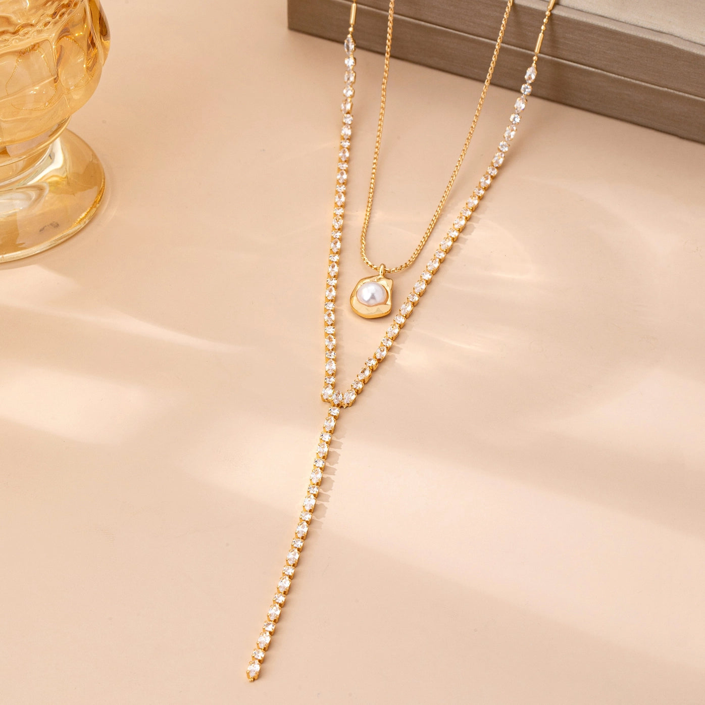 Elegance that drapes beautifully. This Y-style necklace layers pearls with CZ crystals for a look that's dressy enough for date night but easy enough for every day.