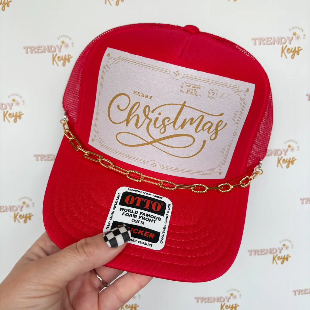 An upscale, classic holiday accessory! This bold red trucker hat features an elegant gold foil script "Merry Christmas" on a graphic that resembles a vintage envelope or stamp. The chic gold chain detail completes the premium look. A sophisticated option for customers seeking a classy Christmas hat that still offers the casual comfort of a trucker.