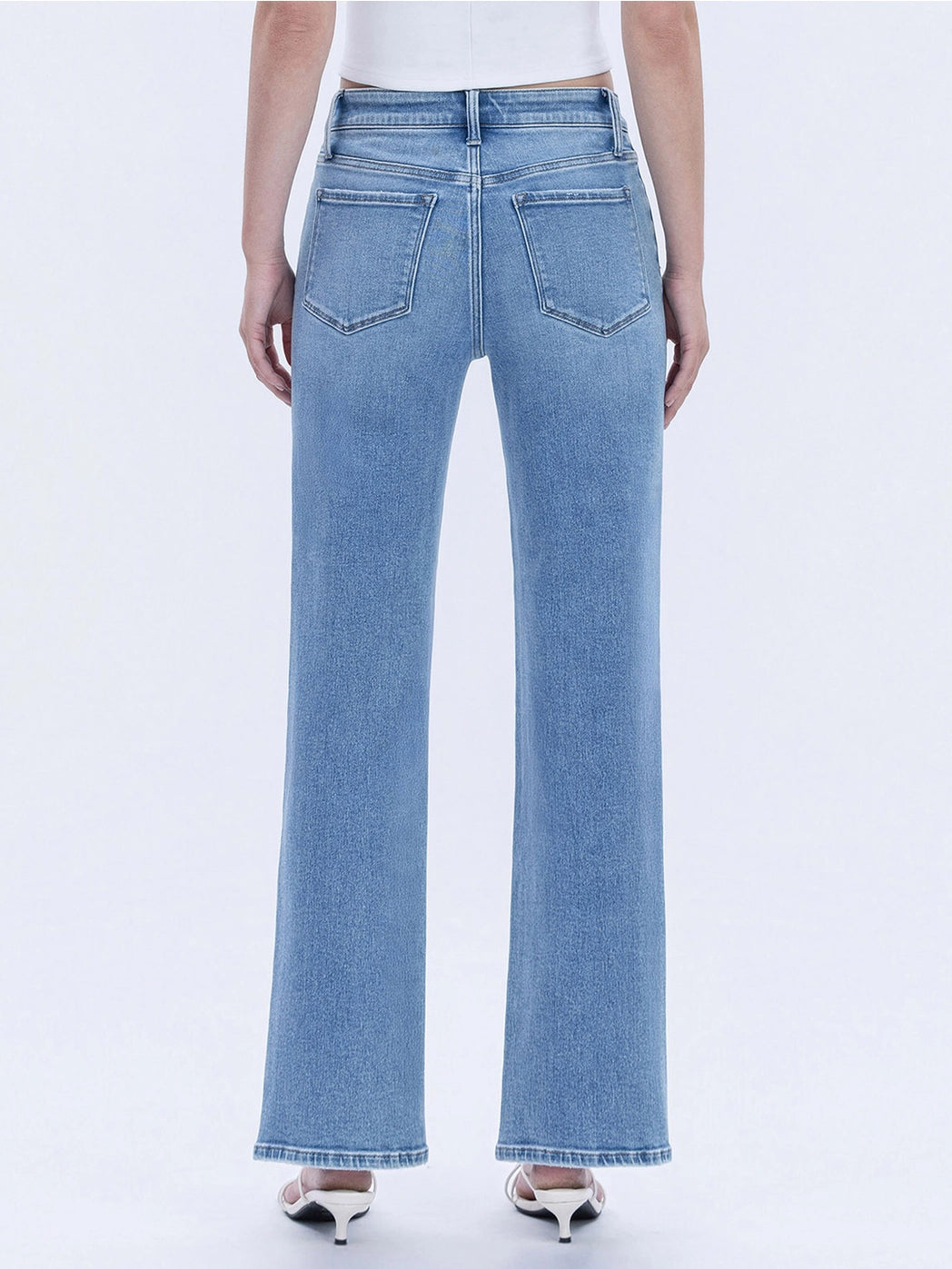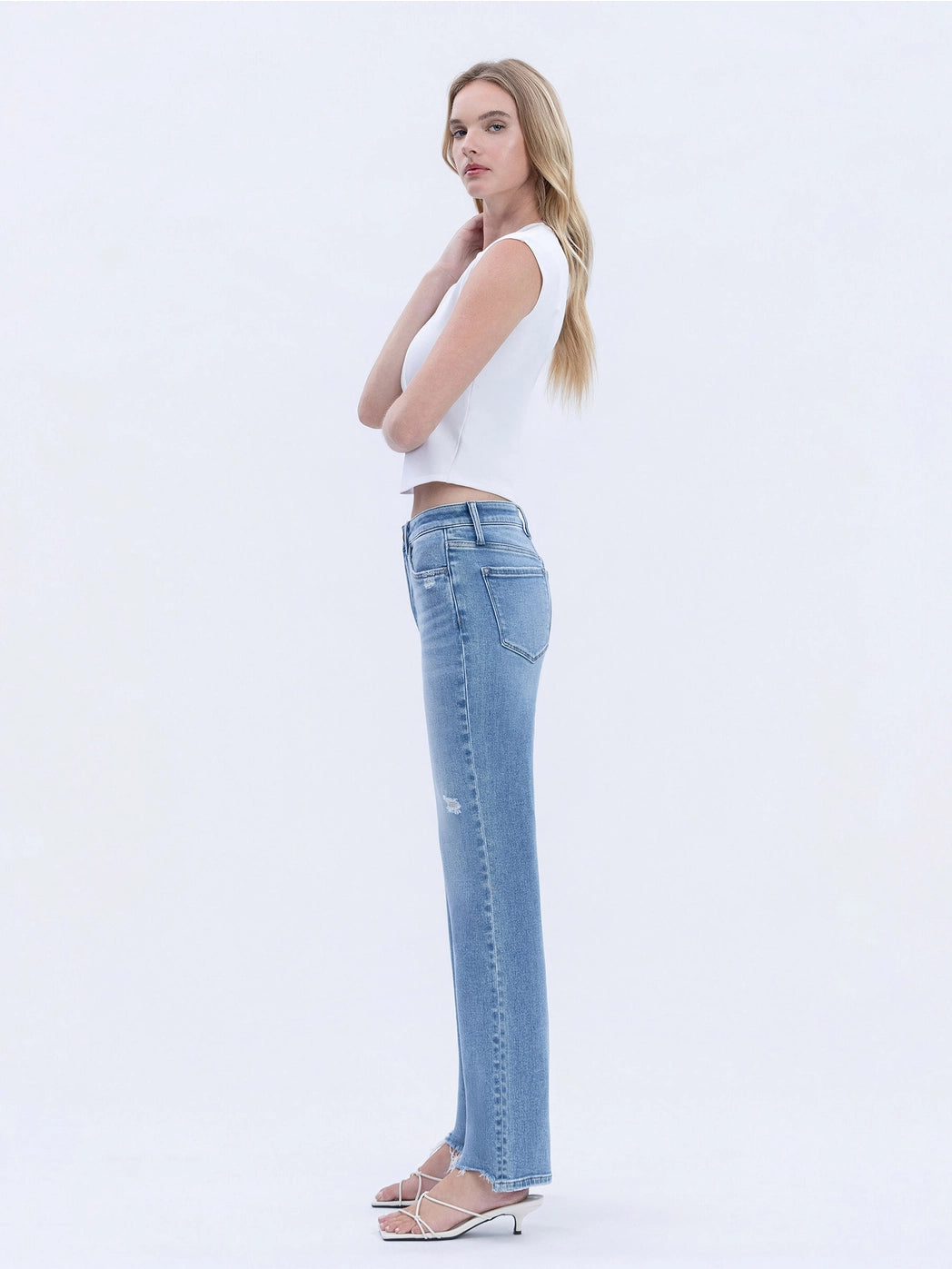 Comfort stretch denim, high rise waist, 5 pockets, front distressed hem, full length, medium light wash, slim wide jeans