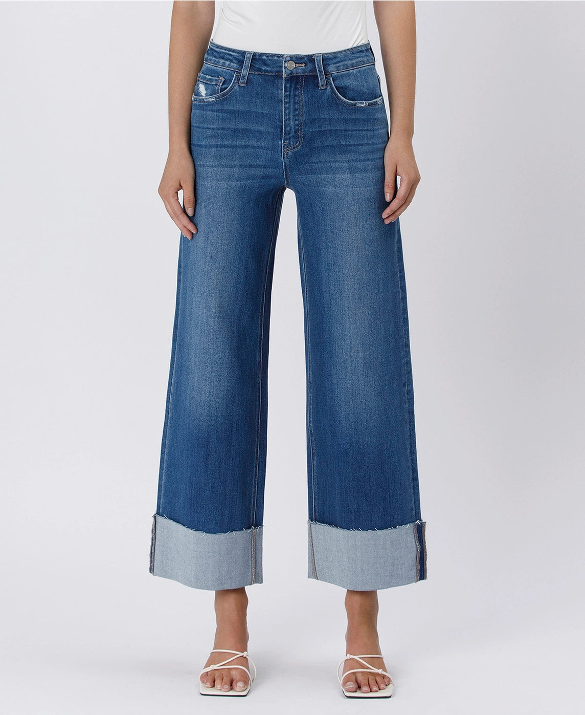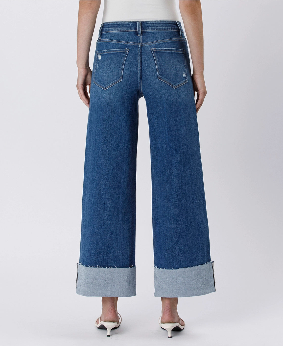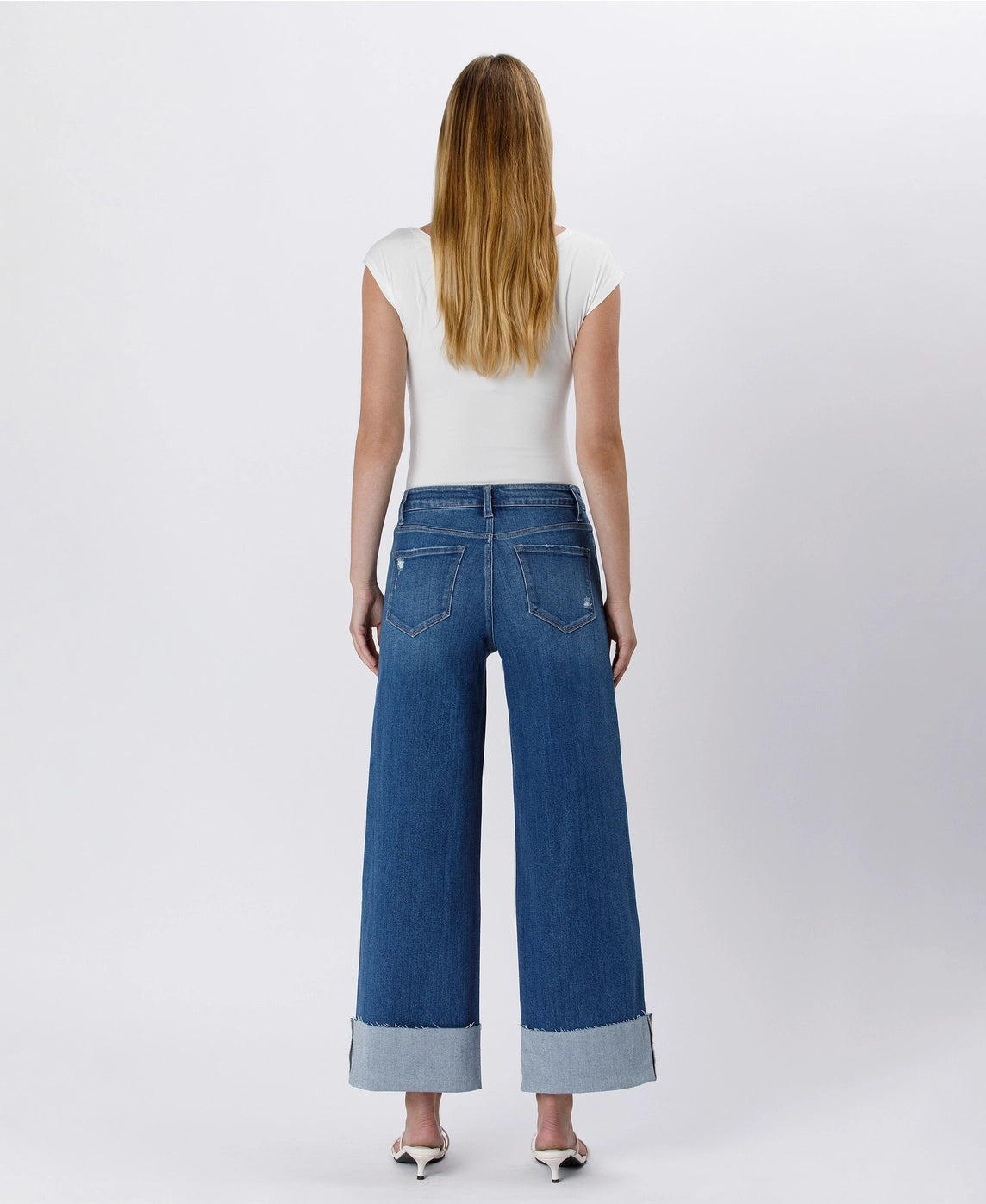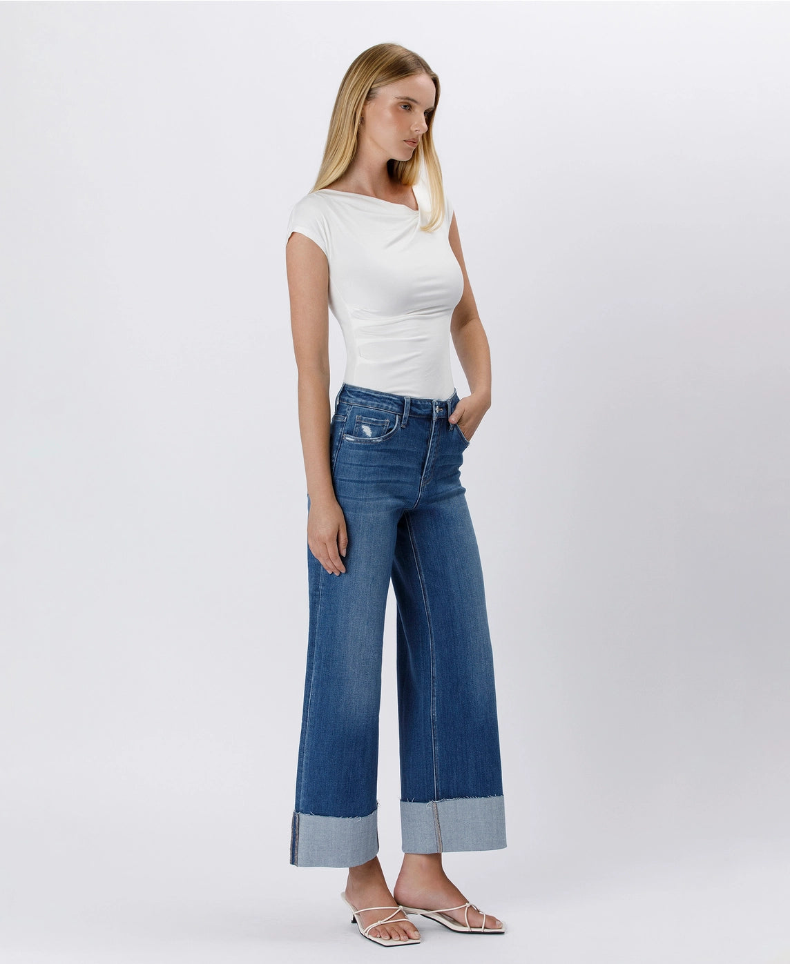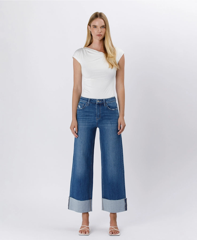 Comfort stretch denim, high rise waist, lightly distressed detail, single cuff hem, ankle length, wide leg jeans