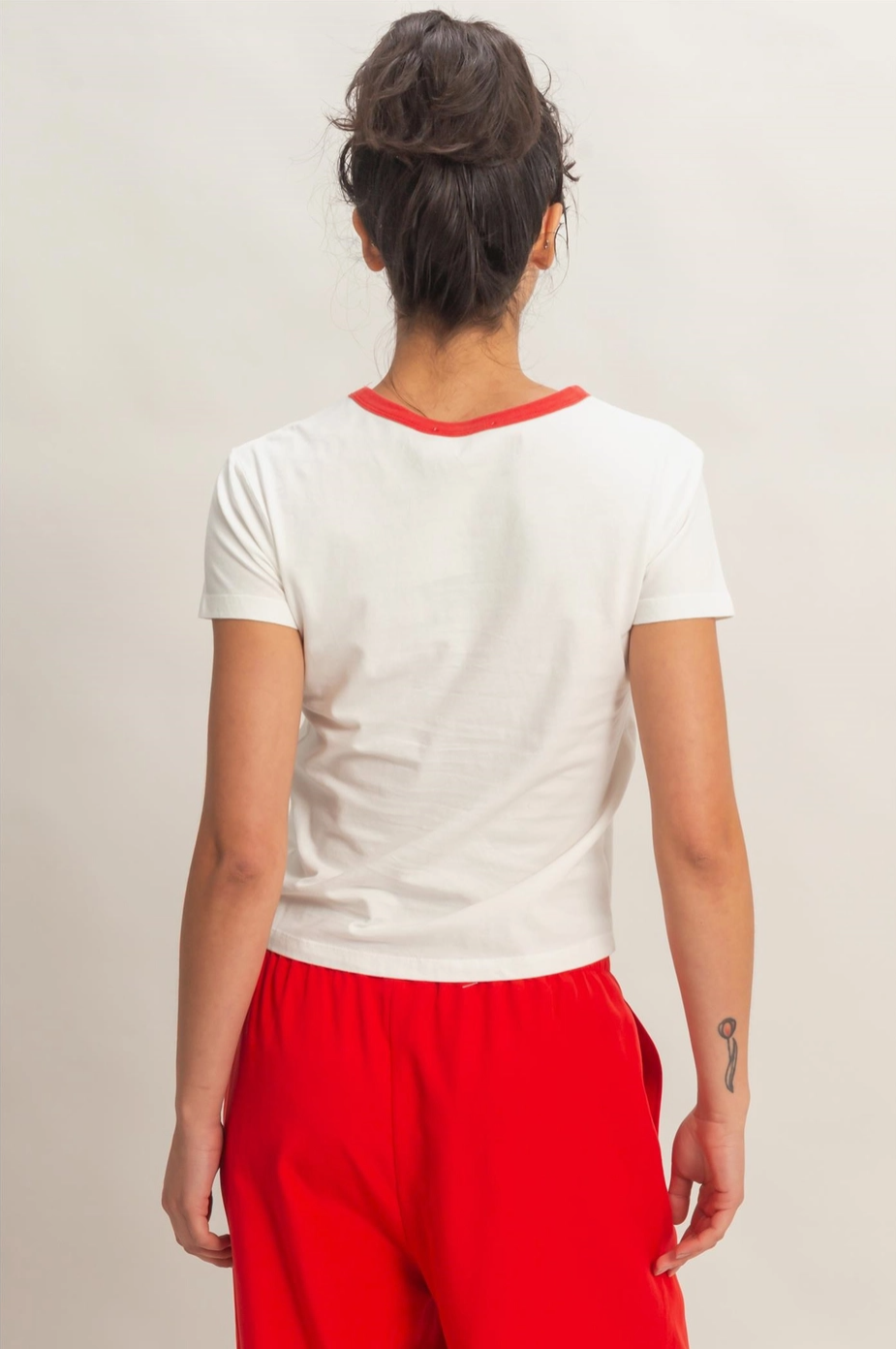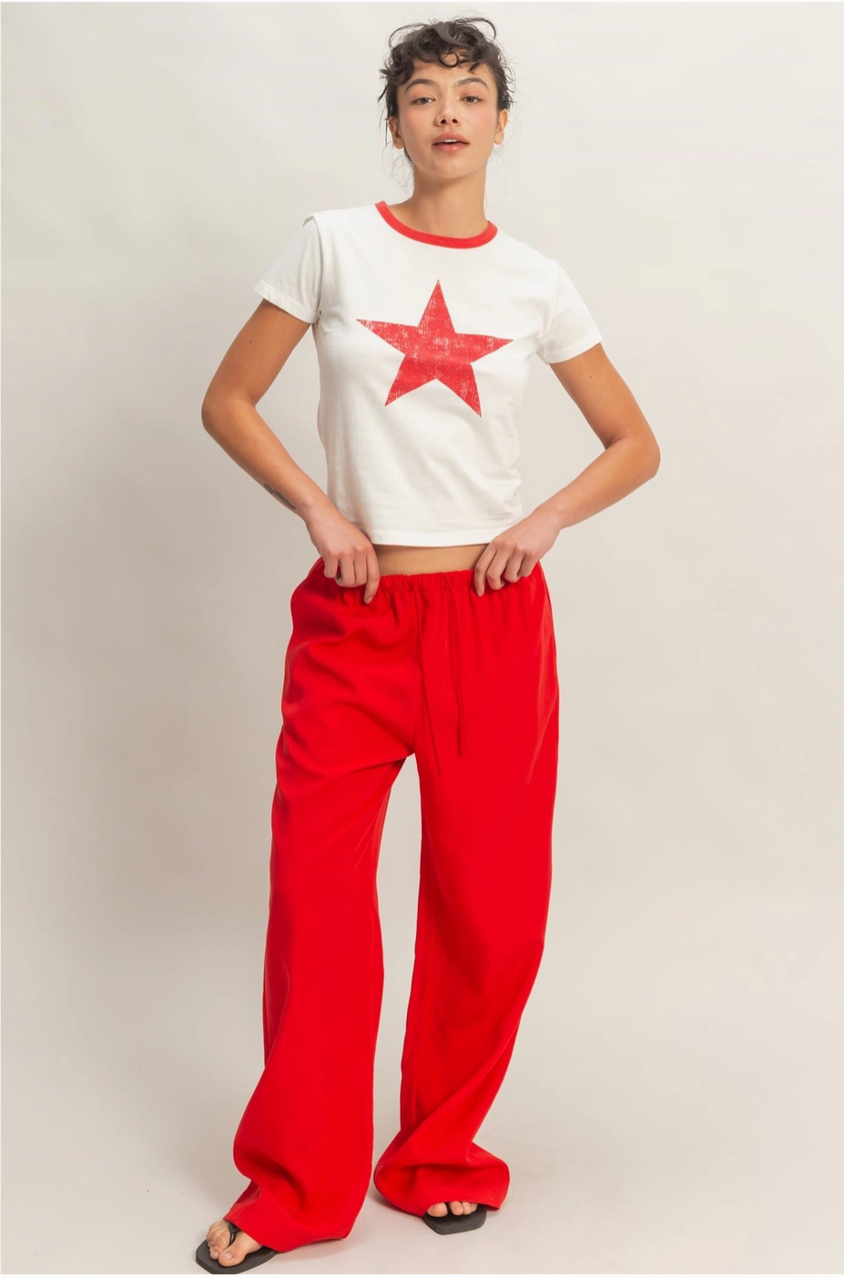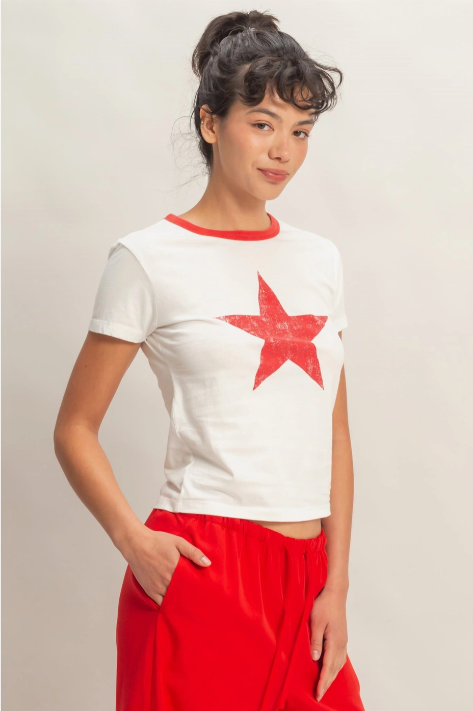 Stars and stripes and everything nice. This graphic crew neck tee in red is fun, casual, and the perfect piece for summer cookouts, concerts, and everything in between. 100% cotton. Model Is 5' 7" Tall, 32" Chest, 25" Waist, 36" Hips And Wearing A Size Small