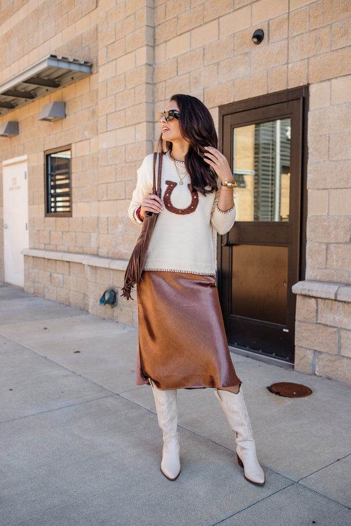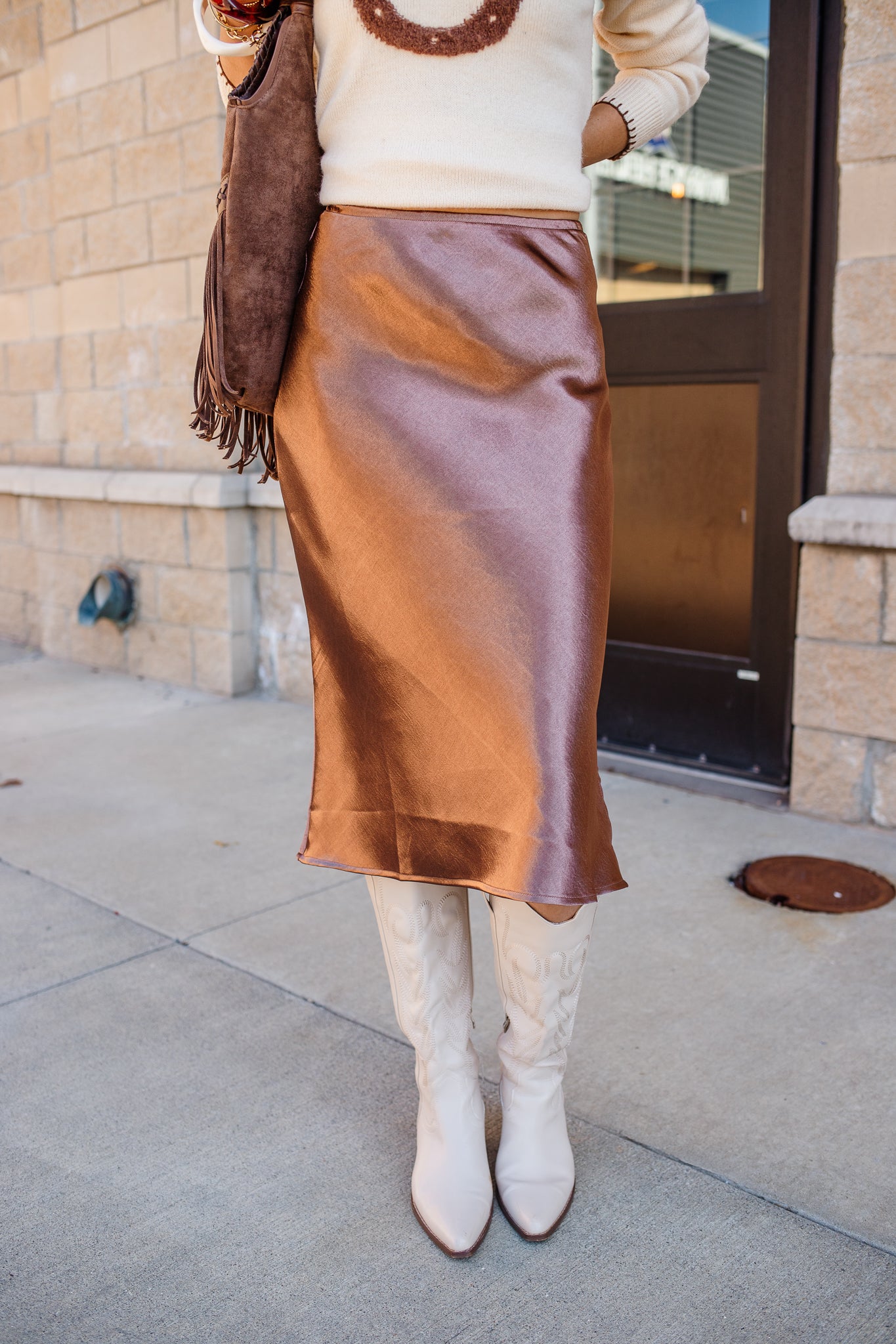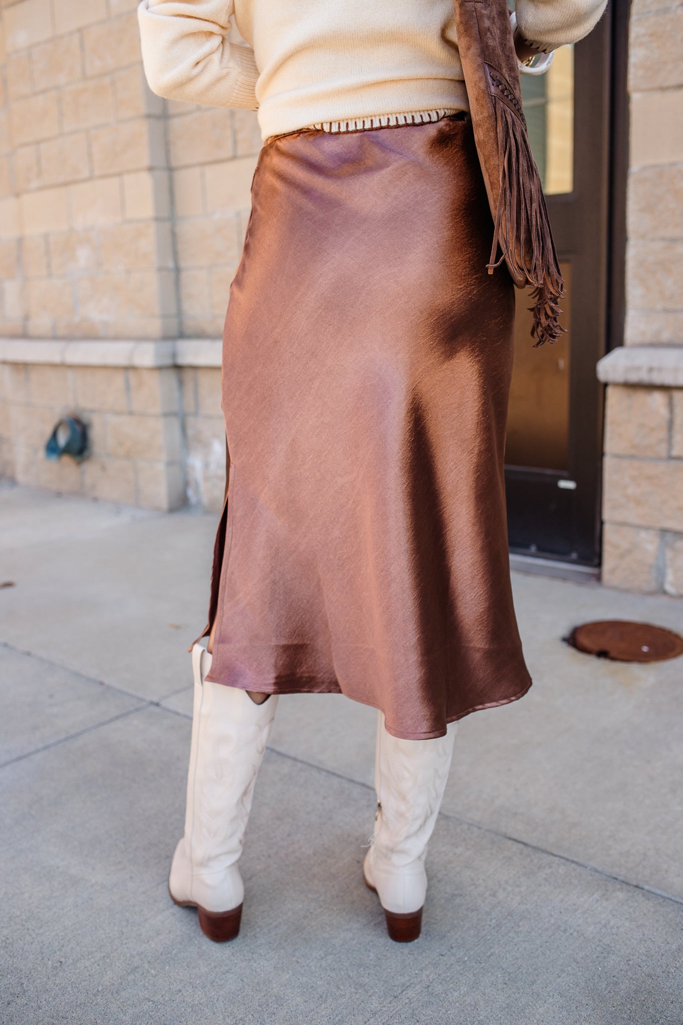 Alex Satin Midi Skirt - Brown - Brown / Small is backordered and will ship as soon as it is back in stock.