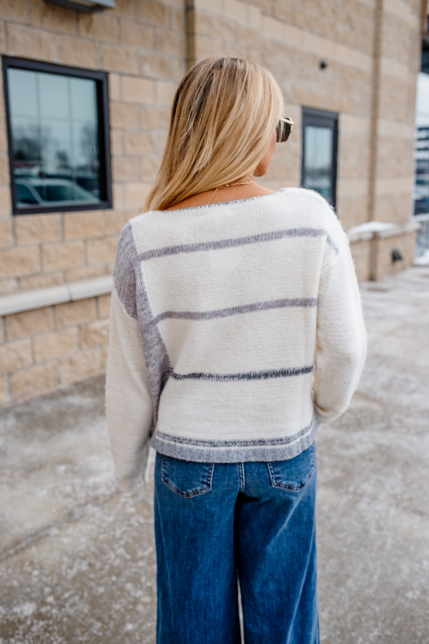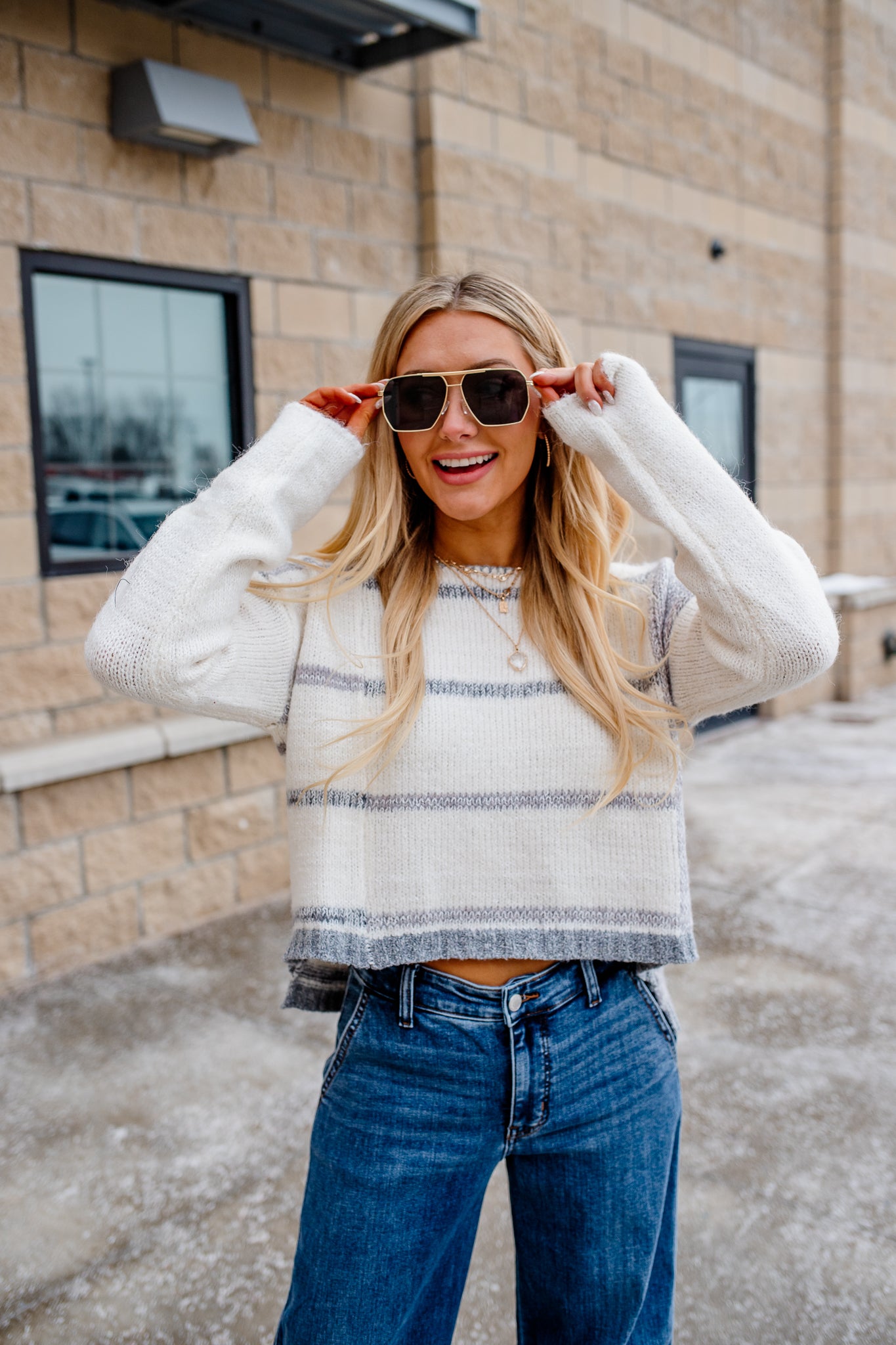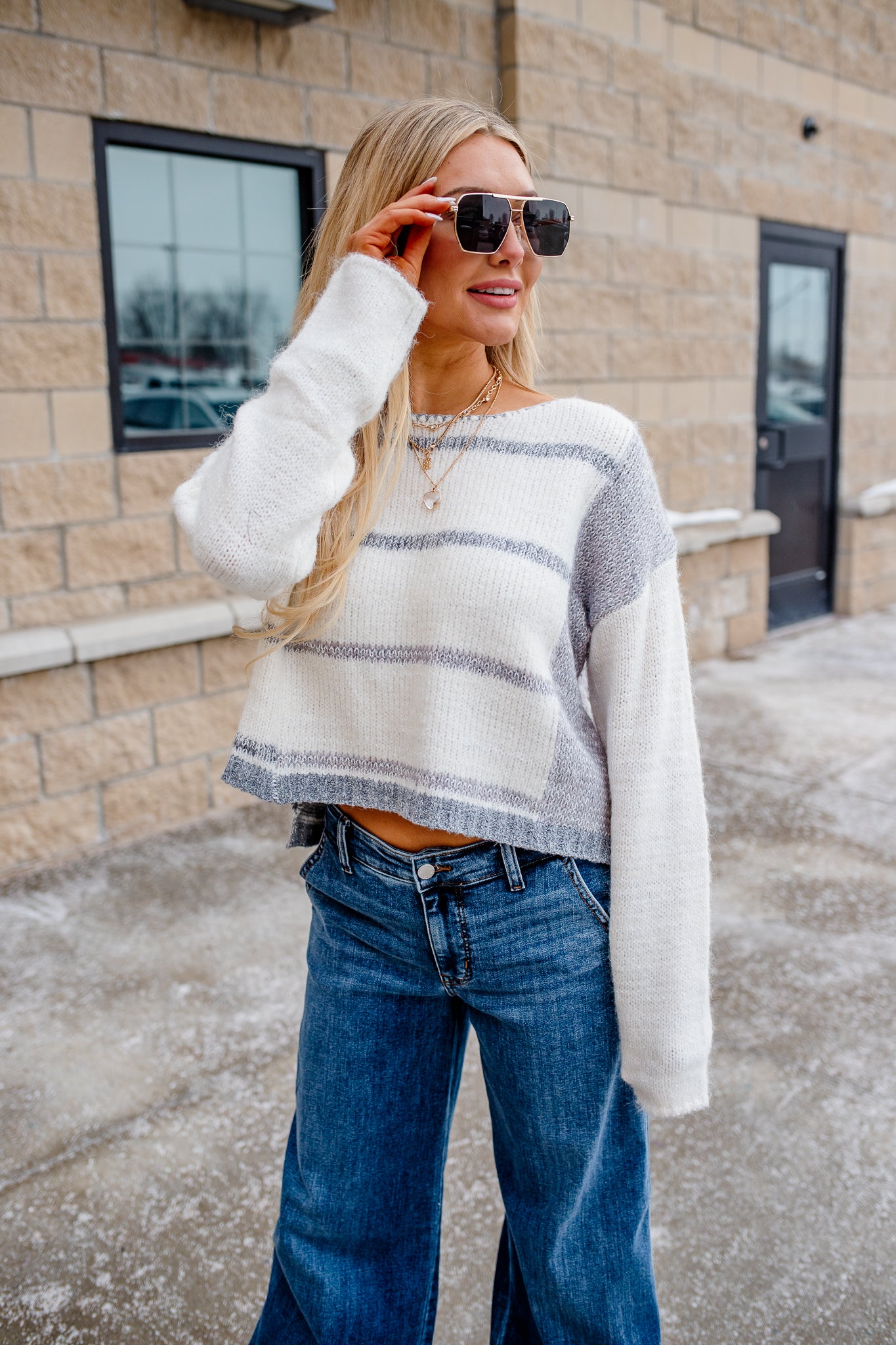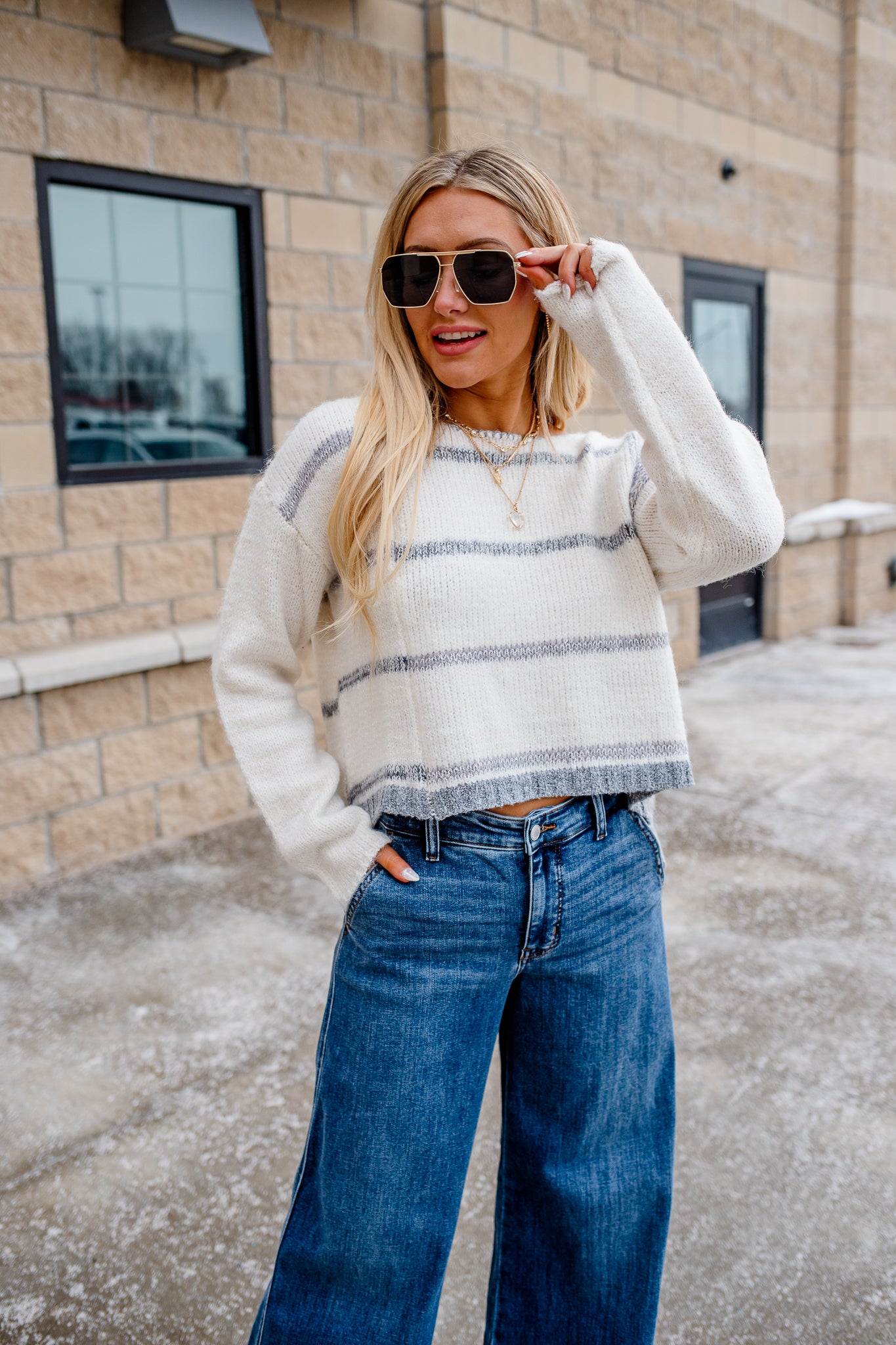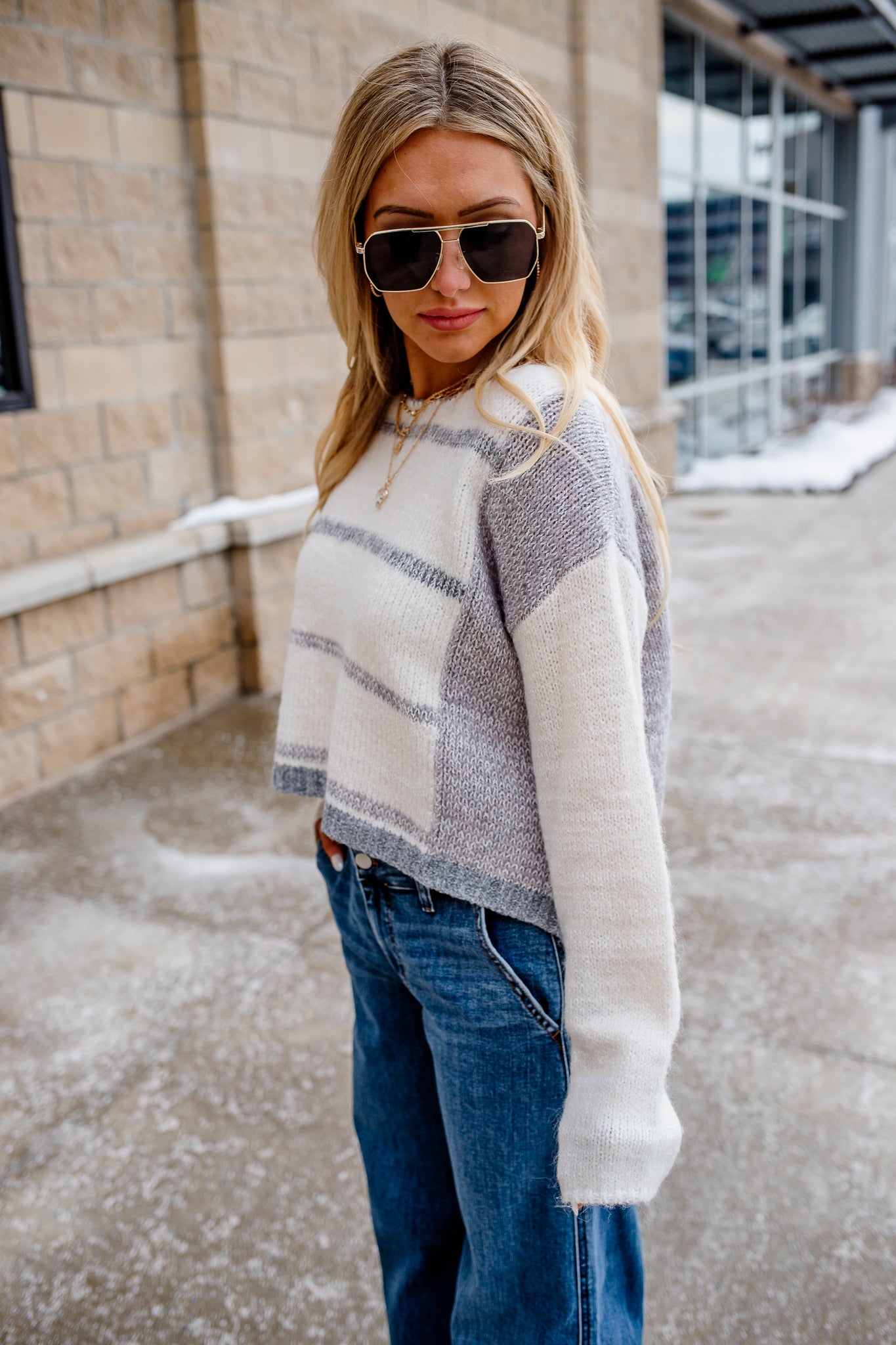 Bold stripes meet refined tailoring in this cropped sweater that refuses to play it safe. The structured ribbed edges and shortened hemline make a statement, while the 95% cotton and 5% spandex blend delivers the comfort to back up the attitude. Ariel rocks it at 5'5" in a small—proof that great style demands a little edge.