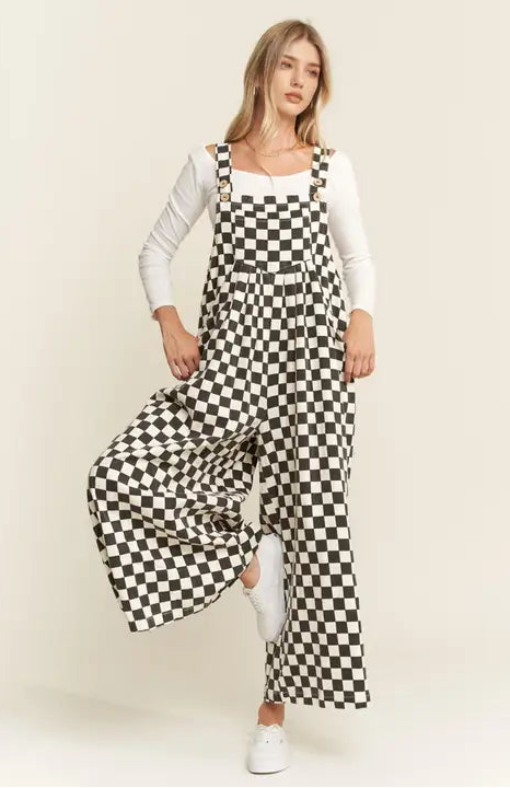 Checkered flag energy in overall form. These wide leg denim overalls in cream and black are bold, fun, and perfect for race day or any day you want to make a statement. The relaxed wide leg fit keeps them comfortable while the checkered pattern keeps all eyes on you.