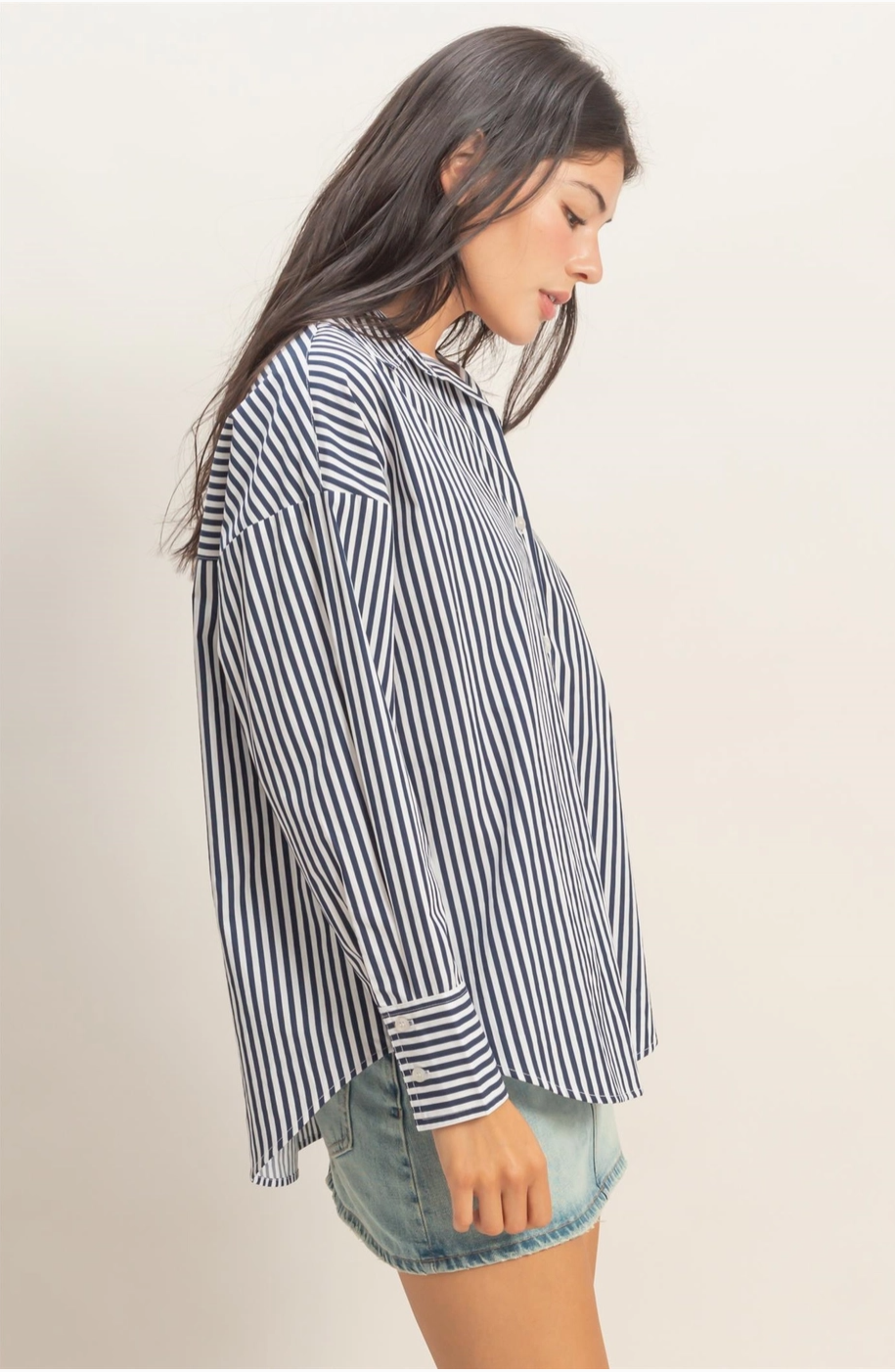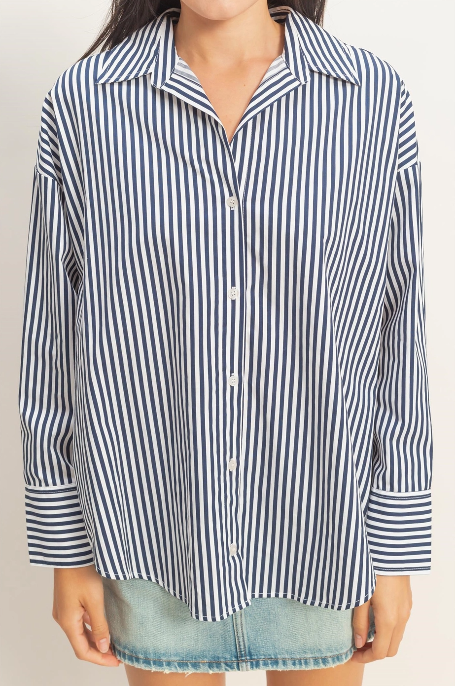 A crisp button-up in navy stripes that's giving seaside sophistication. The poplin fabric keeps it structured but breathable — wear it tucked, tied, or open as a layering piece. One of those tops that makes everything look intentional.