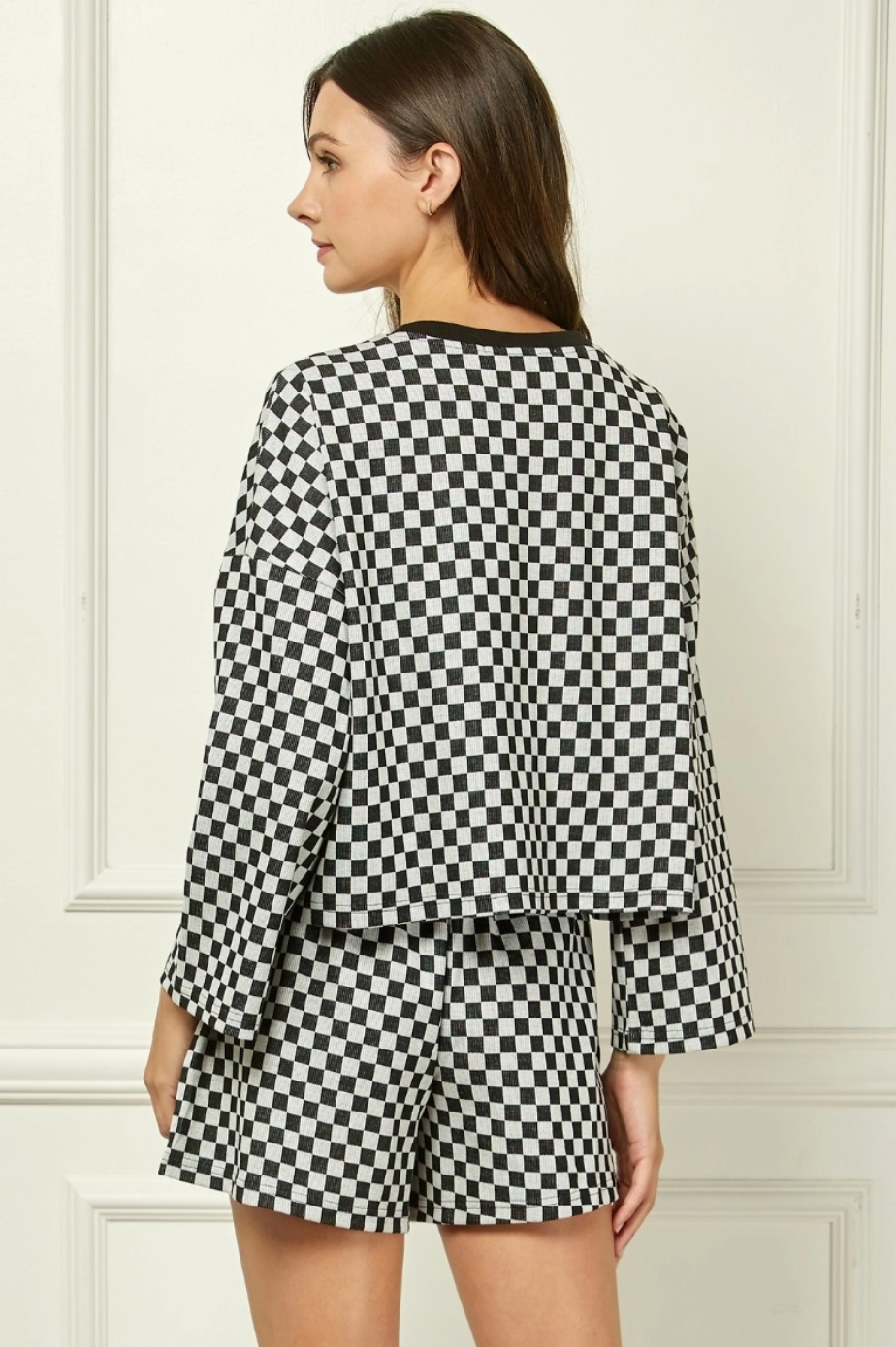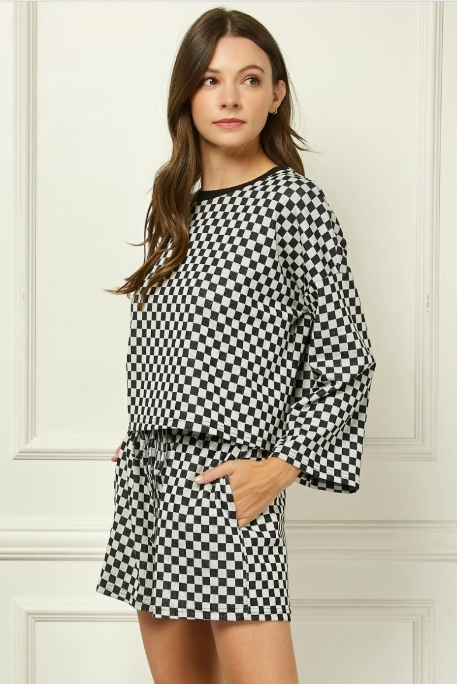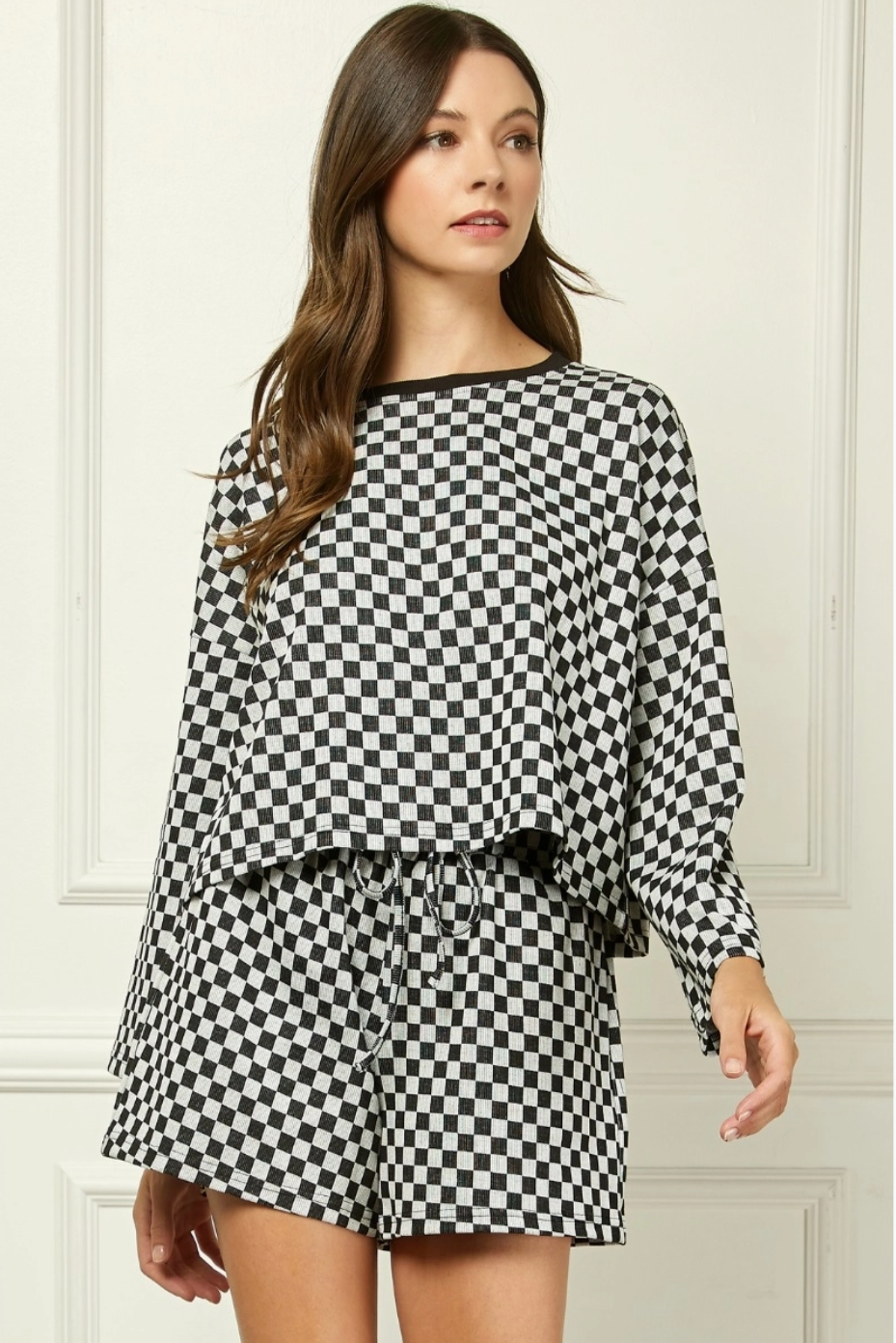 The top half of our favorite checker set. This jersey long sleeve top in black checker print is cozy, stretchy, and effortlessly cool. Pair it with the matching Check Your Style drawstring shorts for a coordinated look, or rock it solo with jeans.