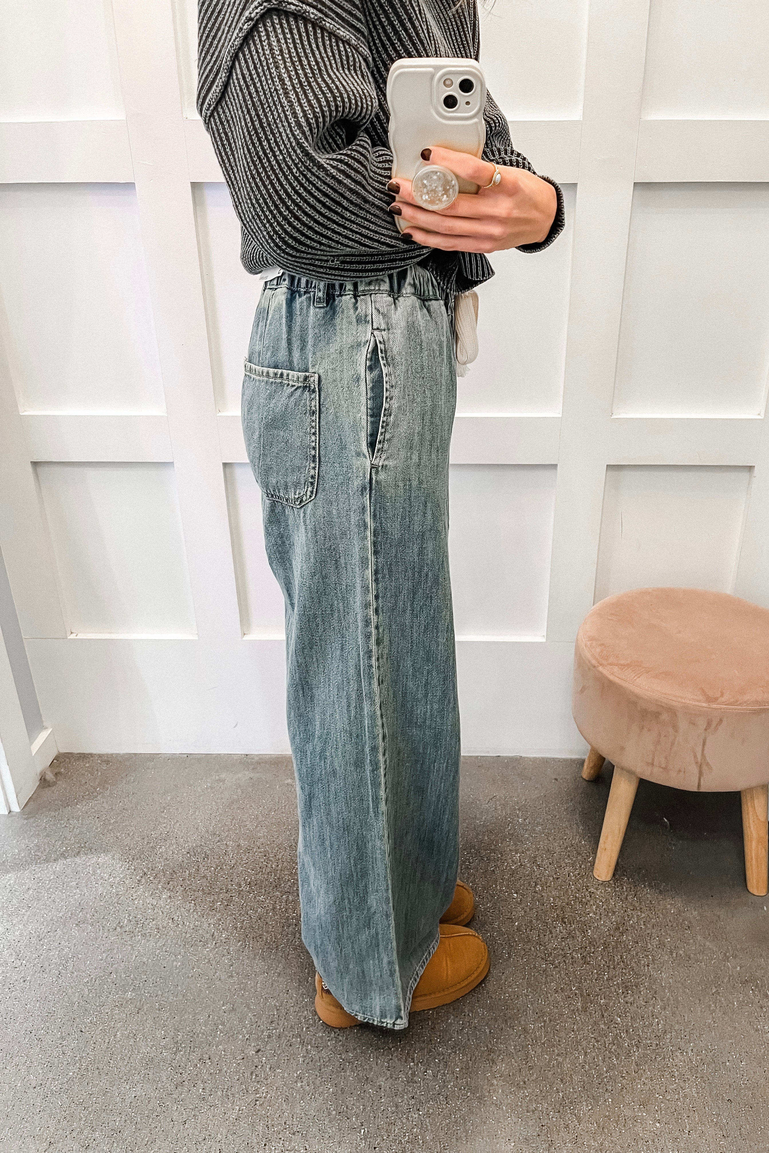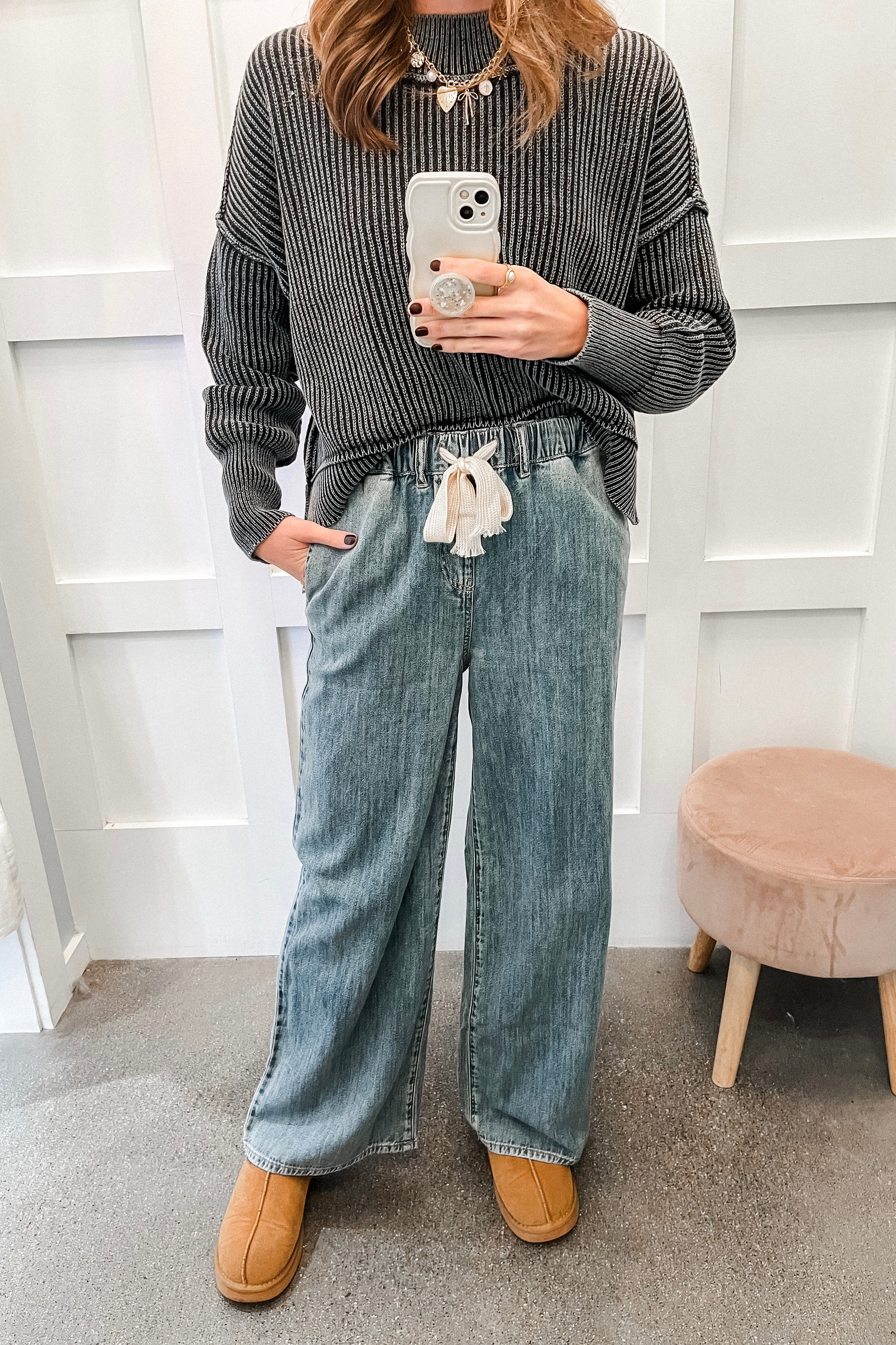 Coco Wide Leg Drawstring Denim Pants - Denim / Small is backordered and will ship as soon as it is back in stock.