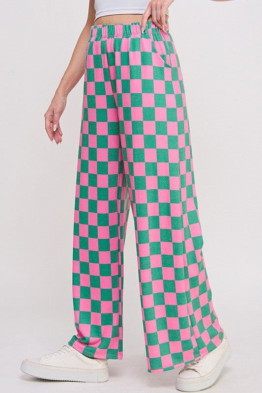 HIGH WAIST CHECKERED STRAIGHT LEG KNIT PANTS -Comfy elastic waistband -Wide leg fit -Pink and green checkered print 80%POLYESTER 15%RAYON 5%SPANDEX