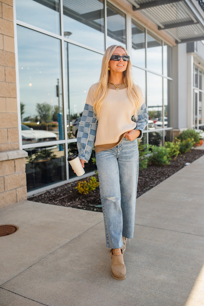 Denim Checkered Sleeve Sweater - Cream / Small is backordered and will ship as soon as it is back in stock.