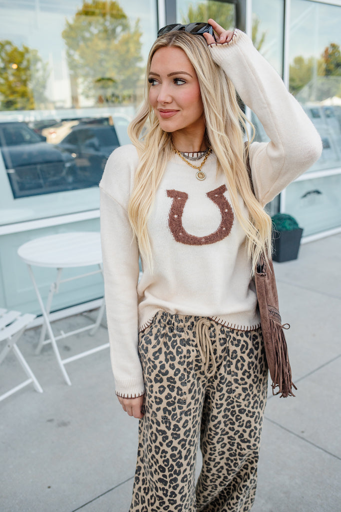 Horse Shoe Embroidered Sweater - Cream / Small is backordered and will ship as soon as it is back in stock.