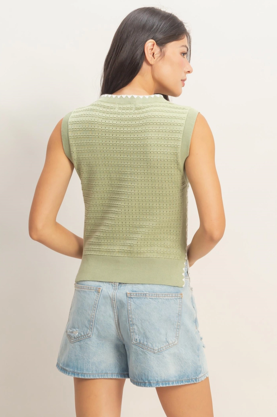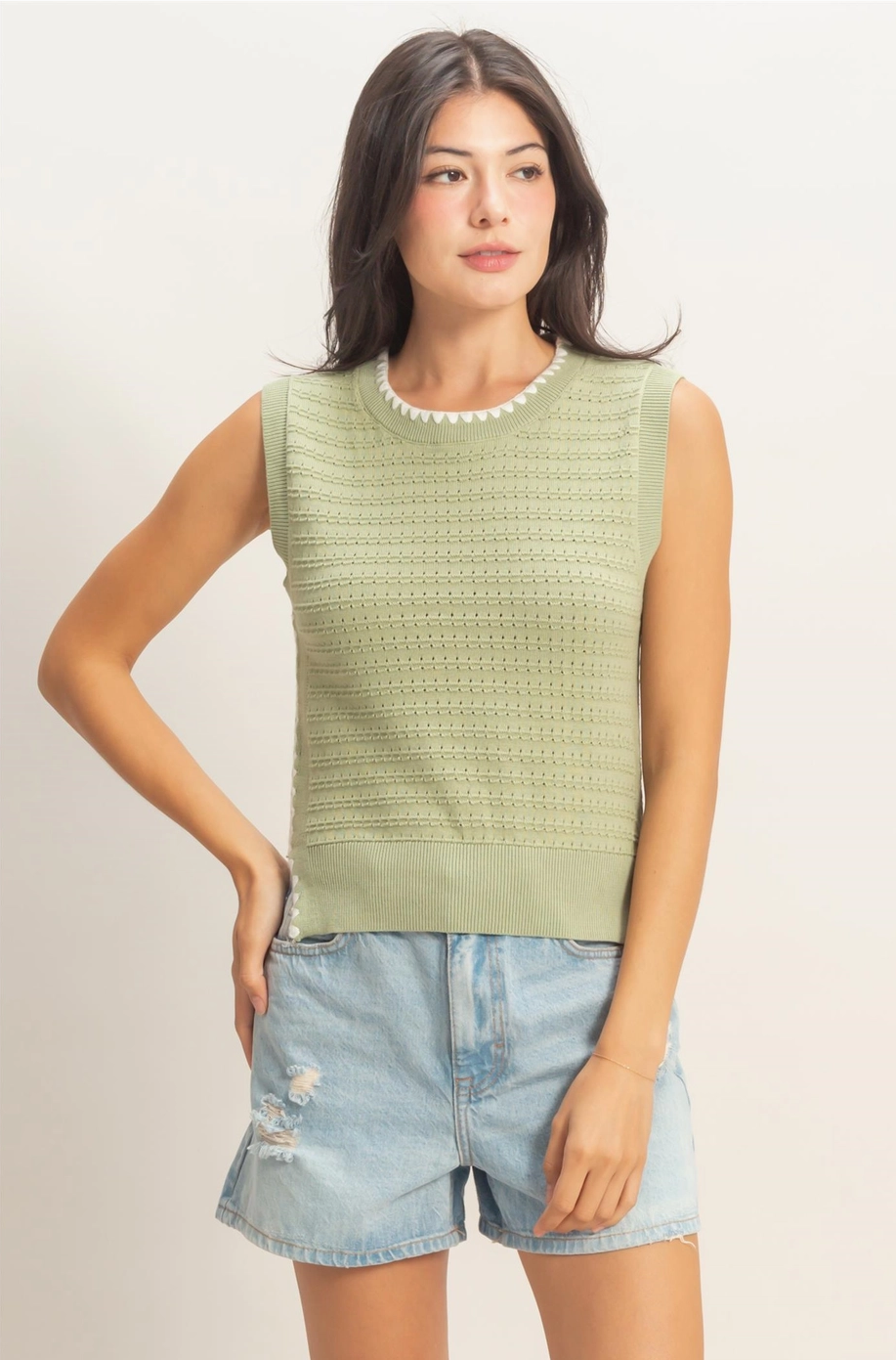 Your new everyday favorite! The textured knit construction paired with distinctive contrast blanket stitching creates visual interest, while the crew neckline offers timeless appeal. Designed in a relaxed, standard fit that skims to the hip, this sleeveless essential provides comfortable layering or standalone wear. The thoughtful blend of 55% acrylic and 45% cotton delivers softness with durability, making it a reliable piece you'll reach for again and again.