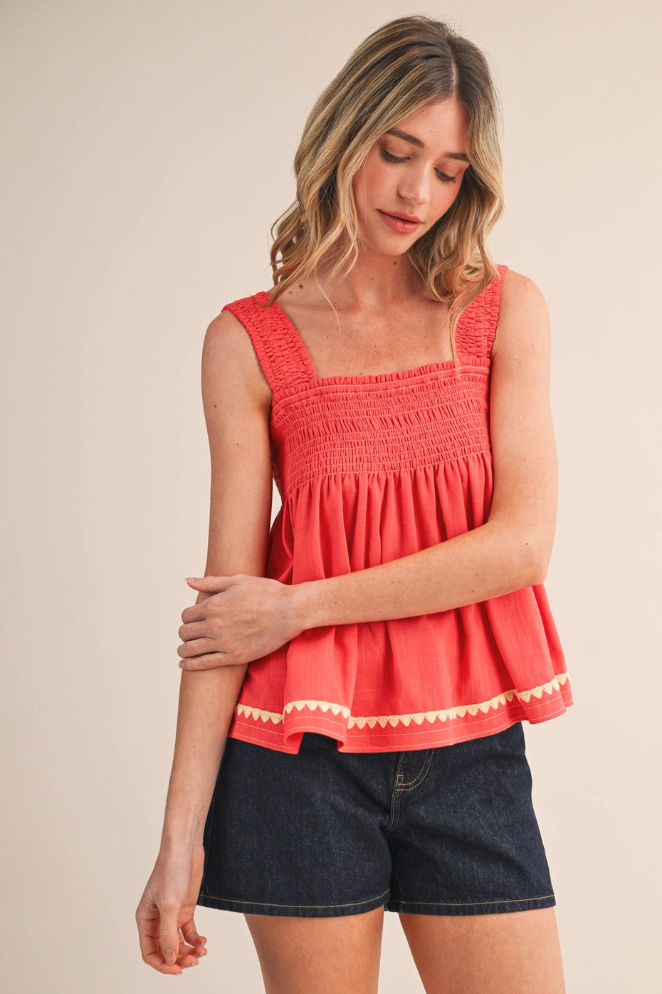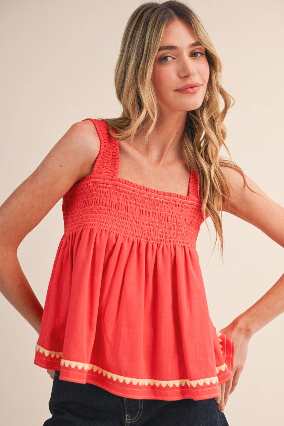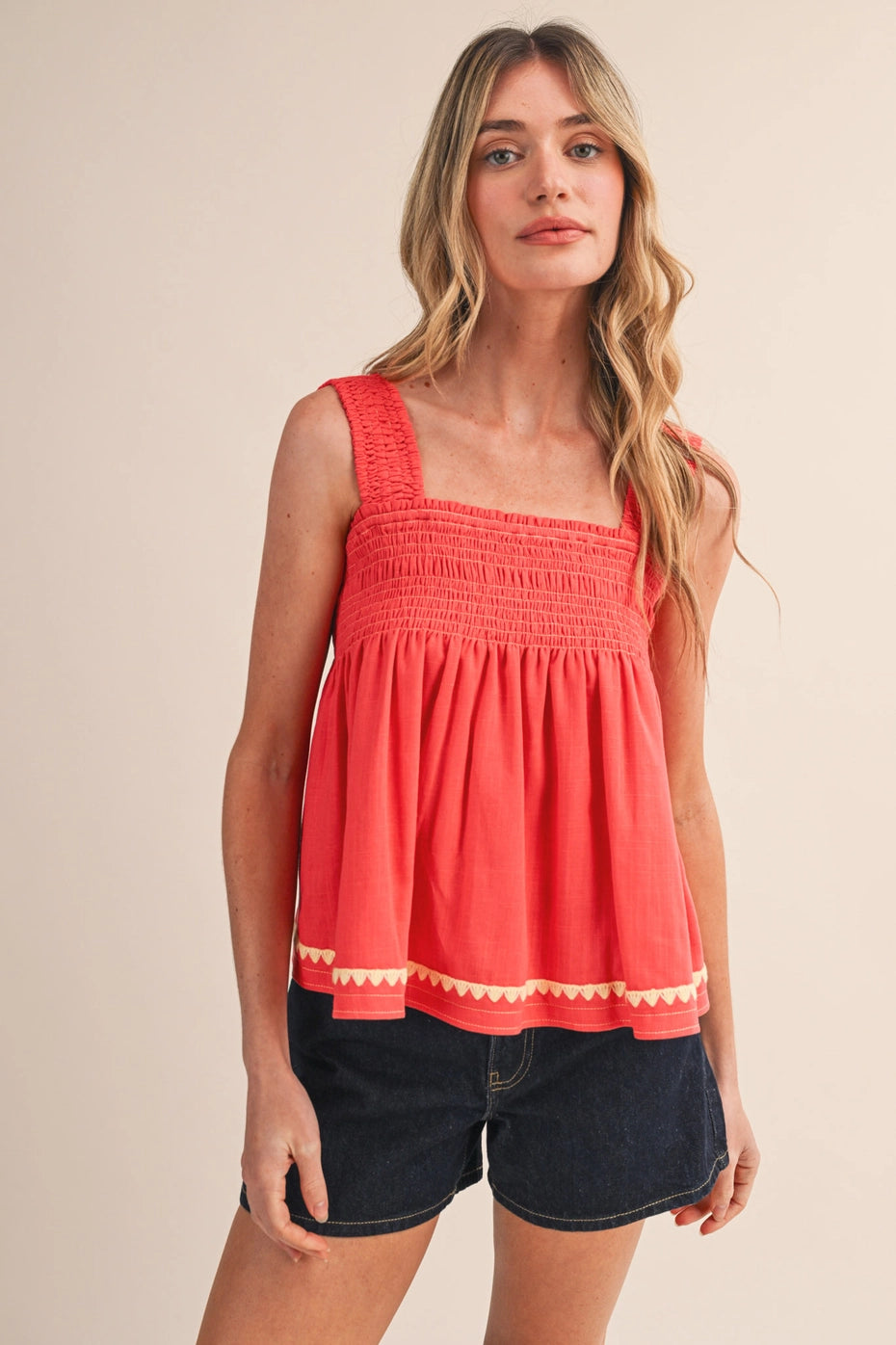 A square neckline on a sleeveless top in coral red? That's main character energy right there. Bold, flattering, and perfect for standing out — tuck it in, layer it under a blazer, or let it shine on its own.