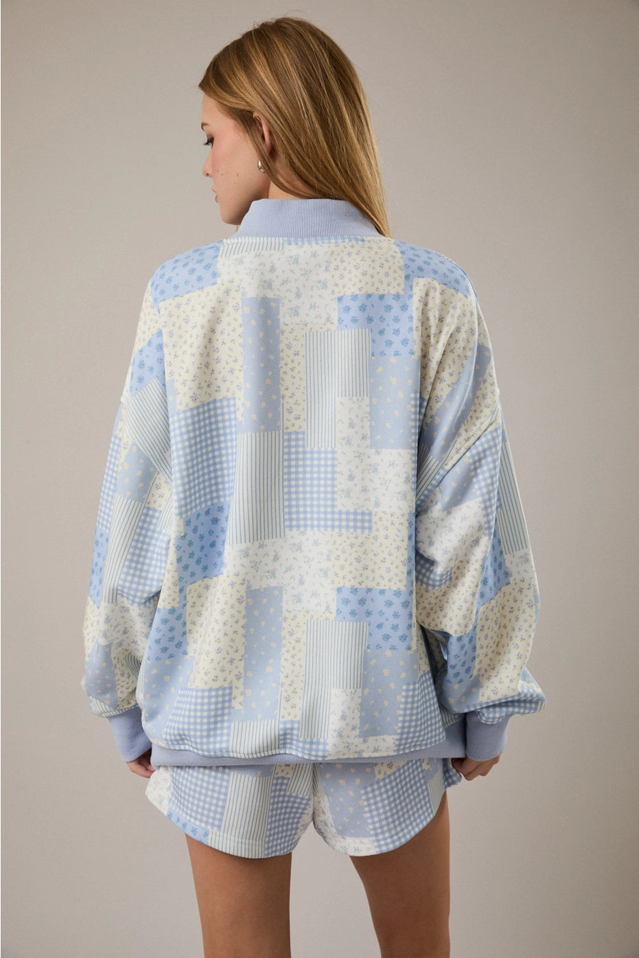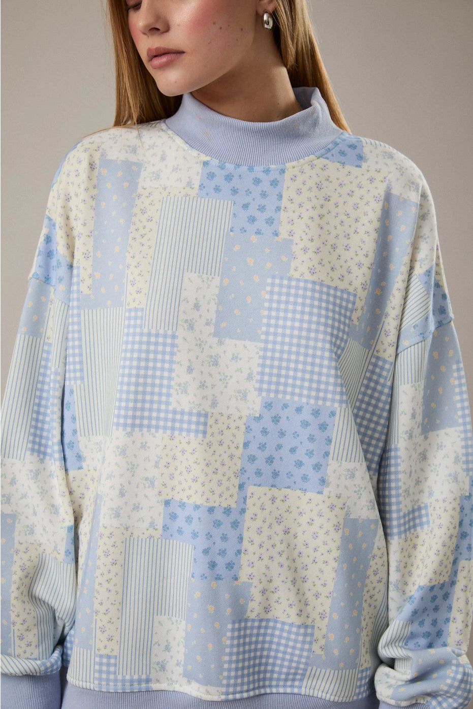 Meet your new favorite cozy layer! This long sleeve mock neck sweatshirt features a gorgeous patchwork print in light blue multi tones. Pair it with the matching sweatshorts for a coordinated set or wear it solo with jeans.