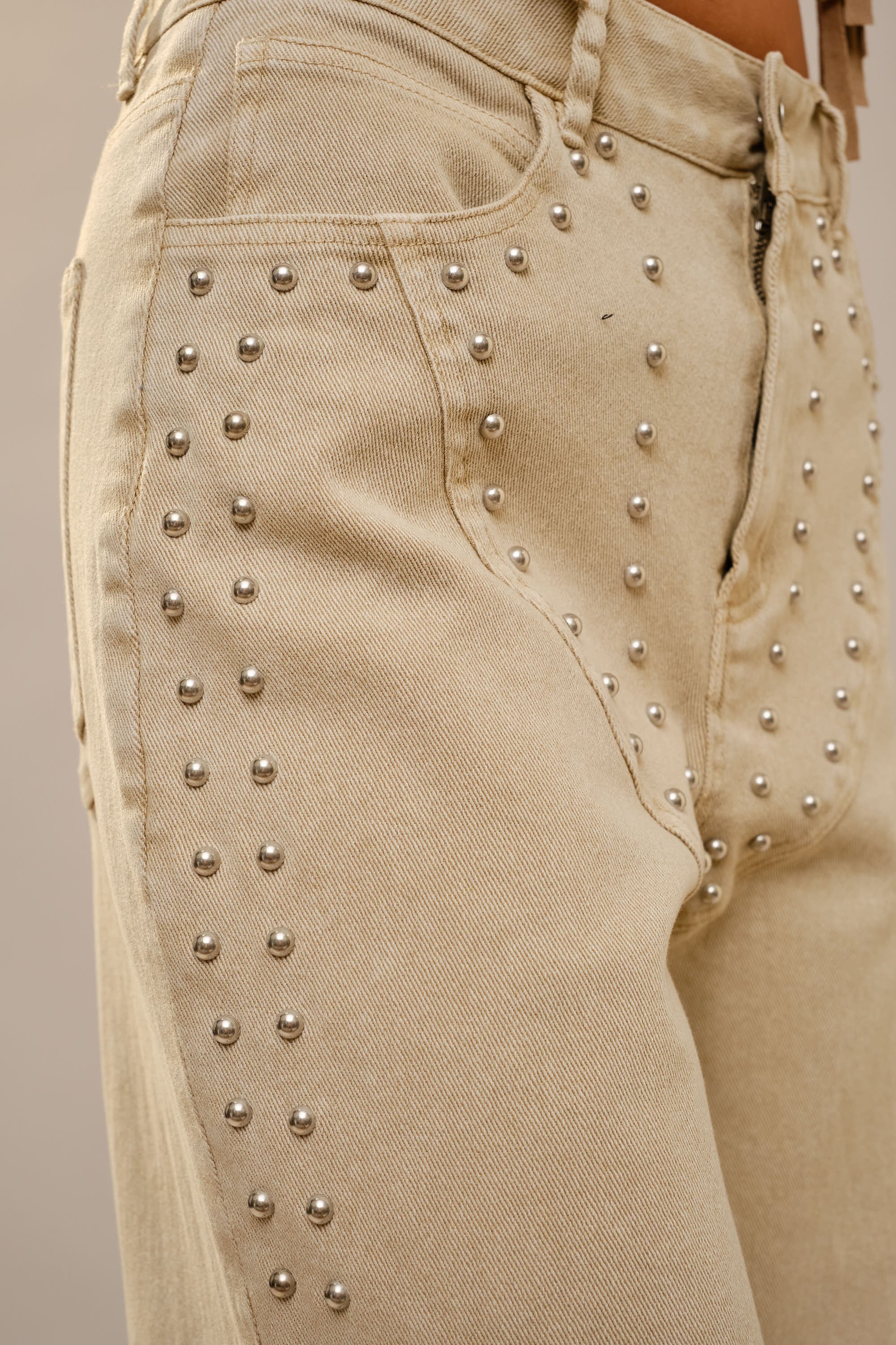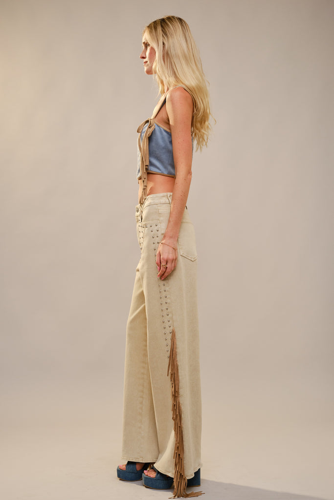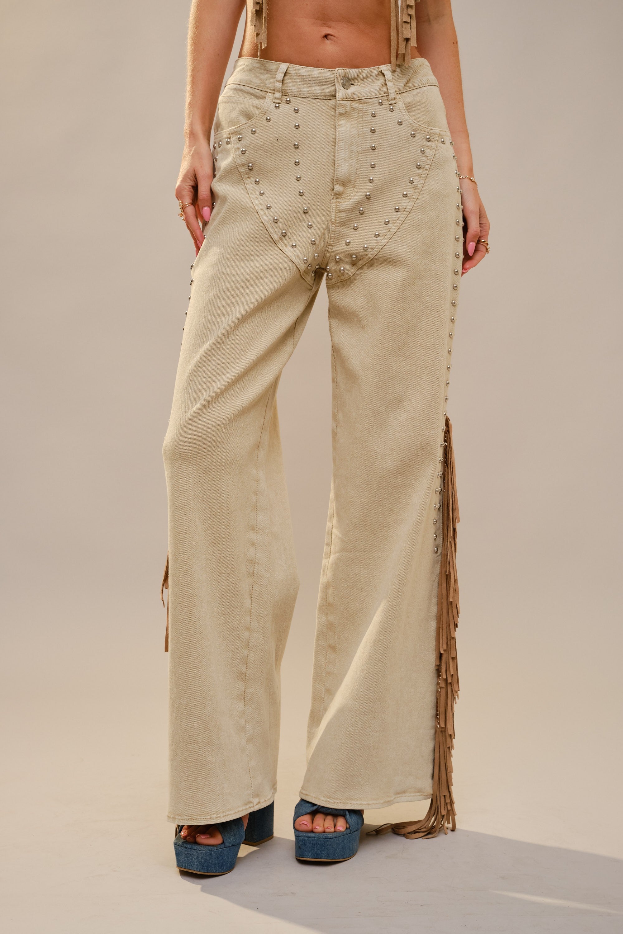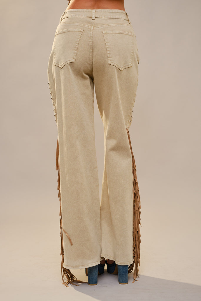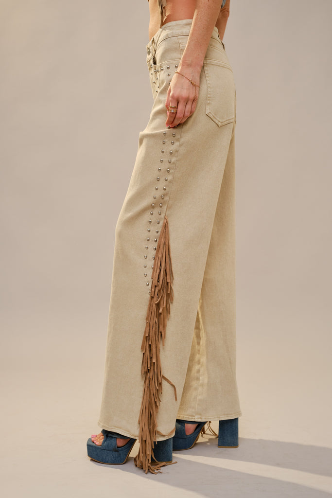 Rodeo Fringe Studded Jeans - Camel / Small is backordered and will ship as soon as it is back in stock.
