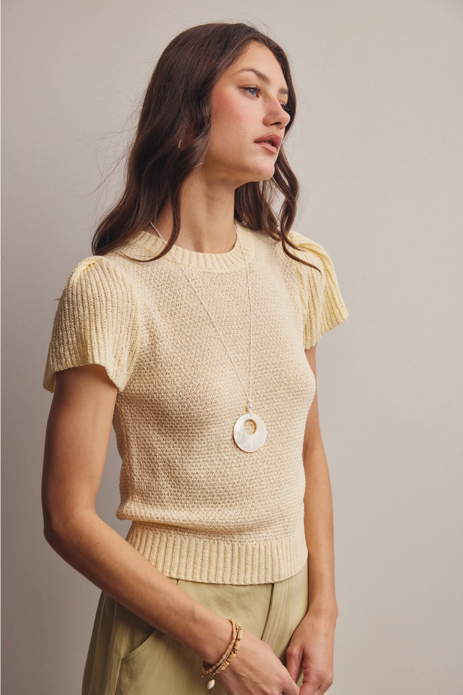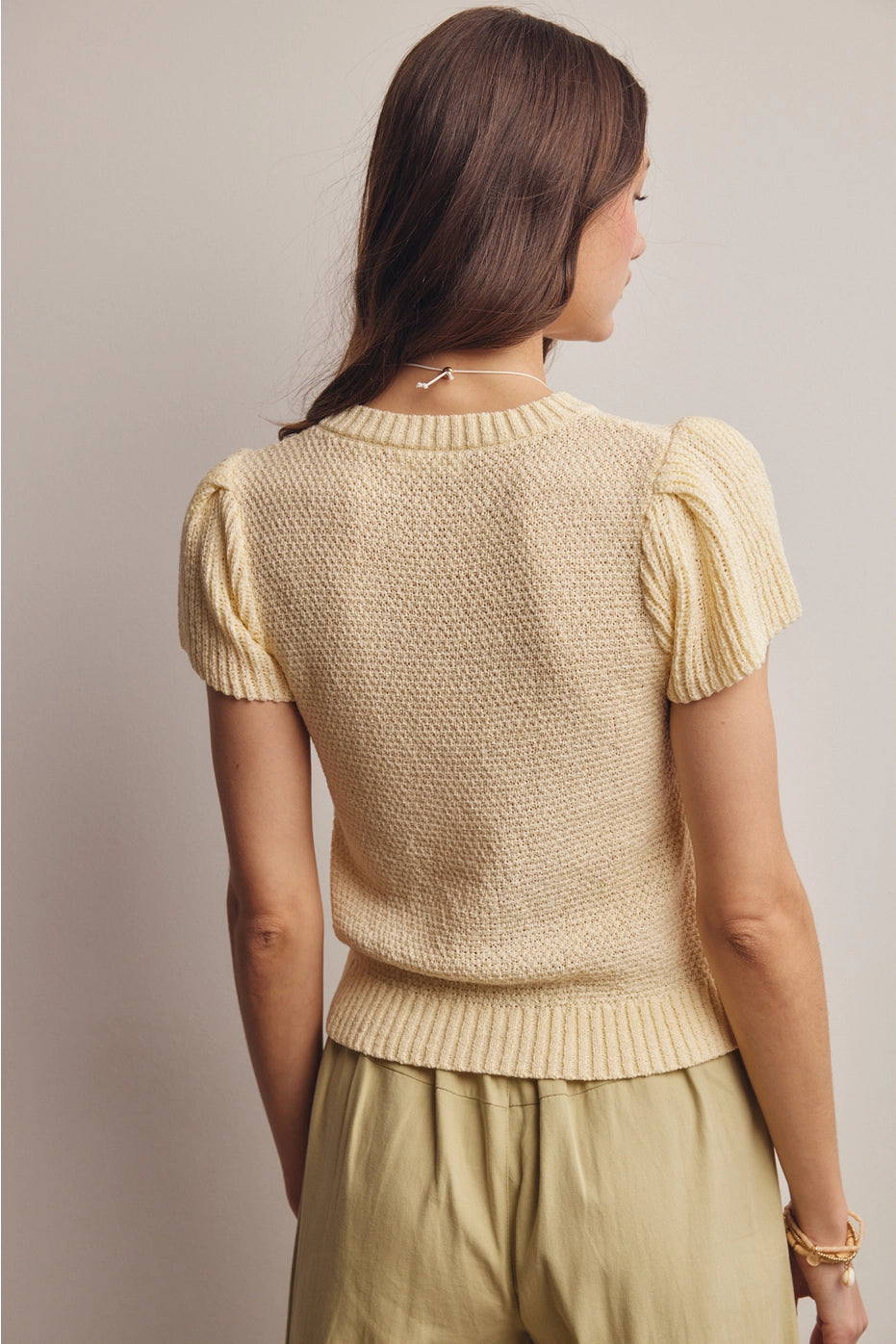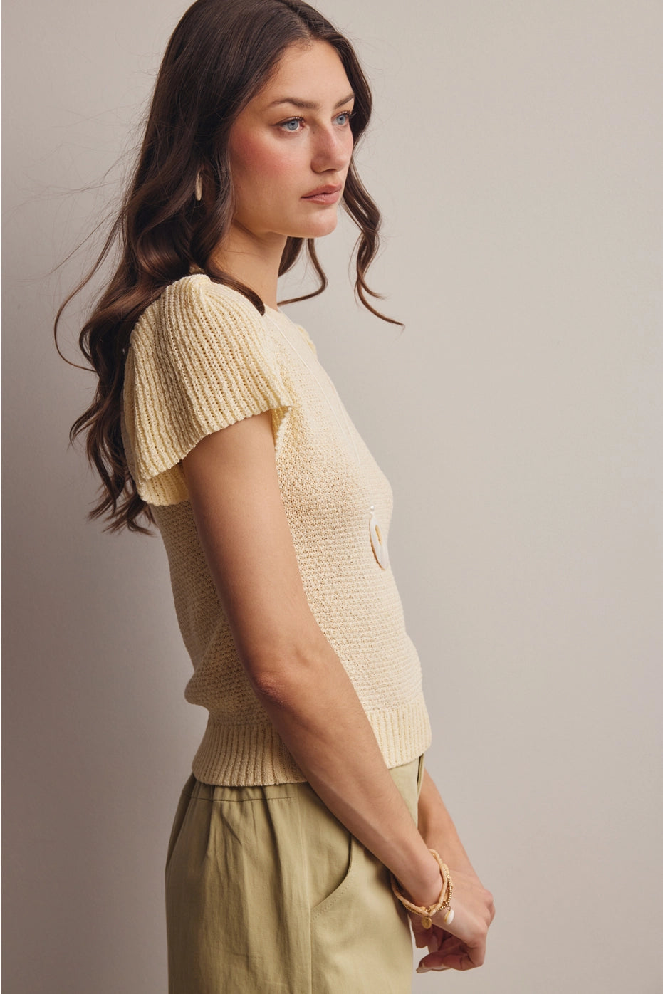 A knit sweater top with the prettiest ruffle sleeve detail. The ivory color keeps it classic and versatile, while the feminine sleeve adds that special something. Tuck it in, leave it out, either way it's a winner.