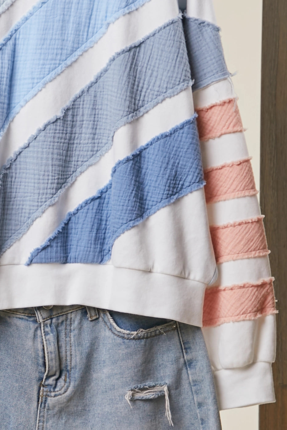 Textured stripes and colorblock detail make this pullover top anything but basic. The off white base keeps it easy to style while the stripe pattern adds visual interest — perfect for throwing on with jeans, linen pants, or tucked into a skirt for a polished look.