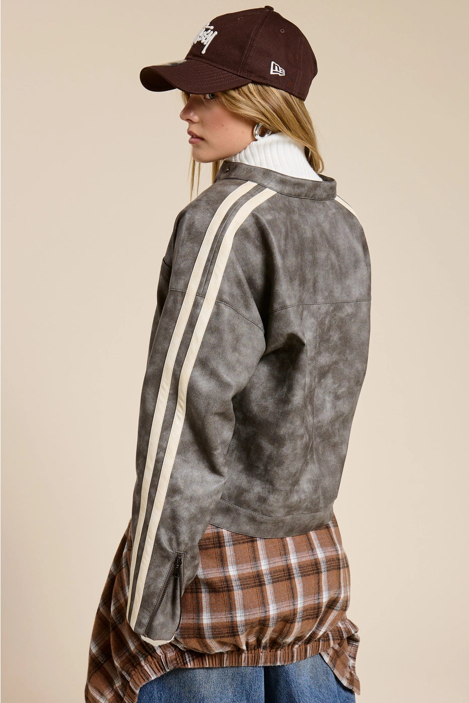A bold outerwear piece with vintage-sport vibes. This washed faux leather moto jacket features a structured round neckline with snap closure, a full zip-up front, zippered cuffs, and utility-style pockets. Finished with double vertical stripes on the sleeves and a relaxed, cropped silhouette, it’s perfect for layering over turtlenecks or flannels for a cool, street-ready fall look. 50% PU 50% POLYESTER.