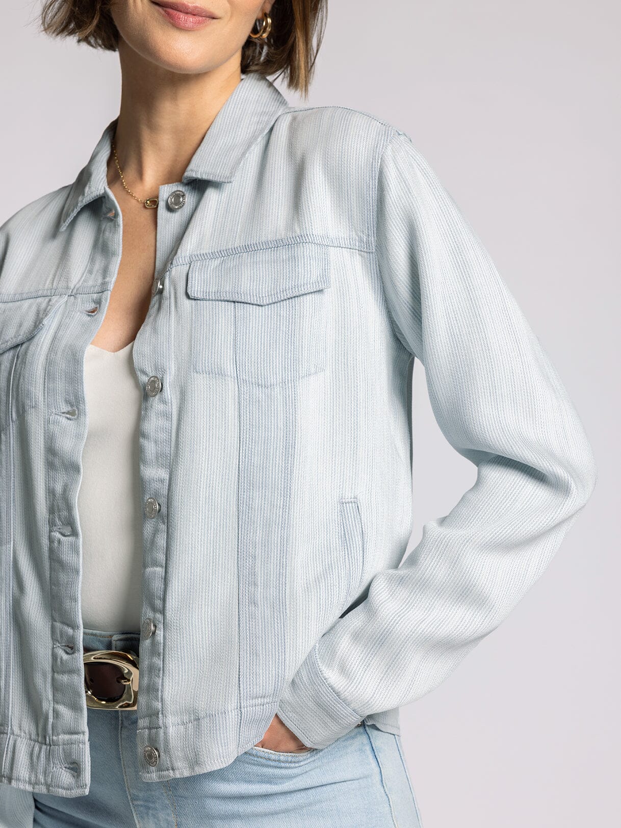 Thread & Supply | Pinstripe Jackie Jacket - Denim / XS is backordered and will ship as soon as it is back in stock.
