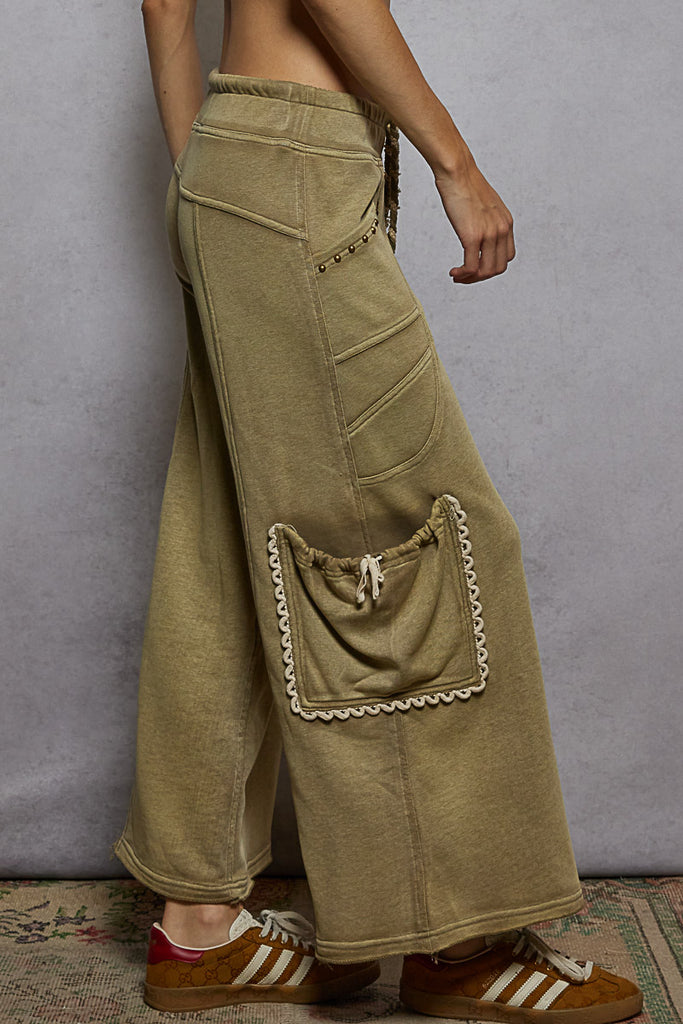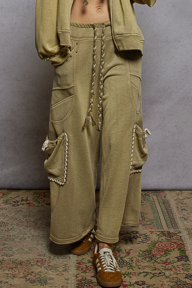 Crafted from soft French terry fabric, these pants feature a relaxed wide-leg silhouette, cargo-style side pockets with stud embellishments, and a comfortable drawstring waistband. Designed to pair perfectly with the Thyme Studded Jacket, they can be worn together as a coordinated set or styled separately for versatile everyday looks.